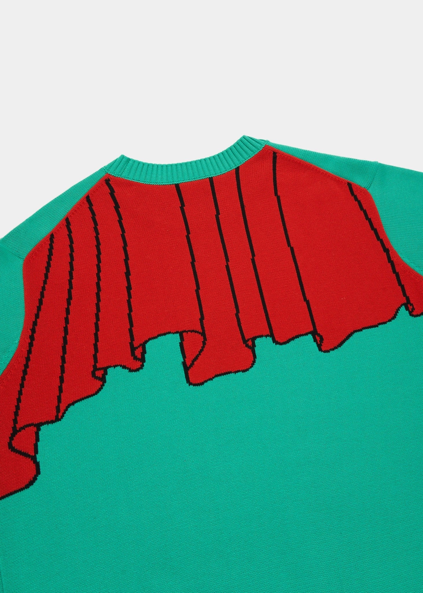 「もともと小さなものを拡大したような質感や、古い雑誌やアメコミの線を取り込んで組み合わせる制作手法が好きなので、その雰囲気がジャガード織で再現されていると感じました。ファミコンのようなドット感が表現されていて嬉しかったです。また、自分が大切にしている赤・青・黄色・黒のトーンが忠実に再現されていると感じました。個展の初日や、少し特別な場所へ出かける日に着たい一着。これまでTシャツやスウェットは数多く制作してきましたが、ニットとのコラボは初めてで、自分自身も着たいと思える仕上がりになりました。」