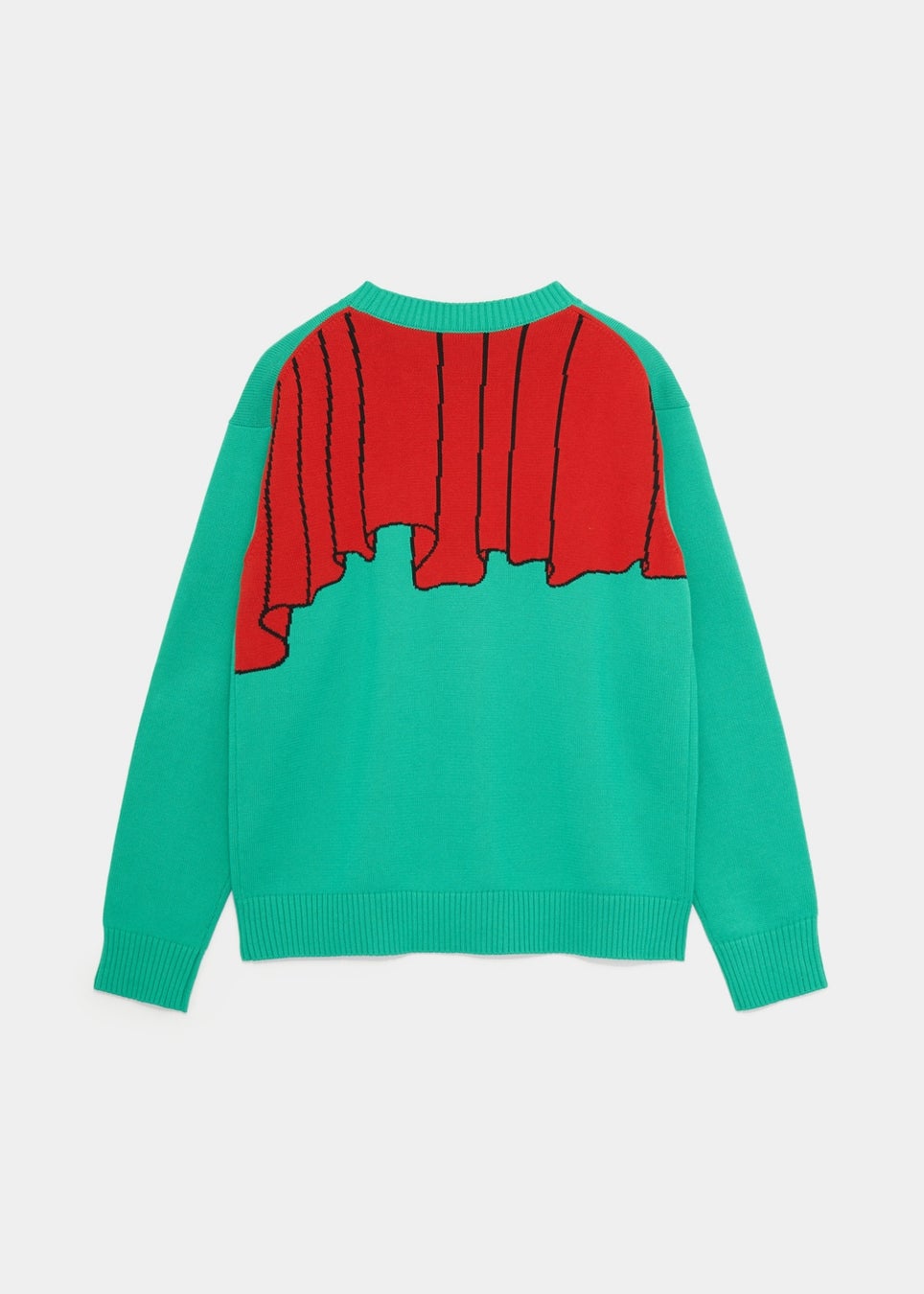 本アイテムは、ユニセックス仕様の地厚なコットンプルオーバーニットを、2サイズ・2カラーで展開いたします。グリーンのバックスタイルには、作家の作品に度々登場するカーテンのモチーフをあしら