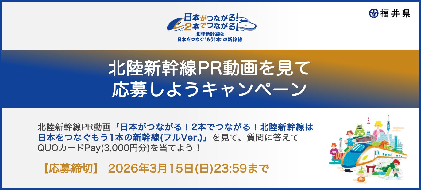 北陸新幹線PR動画「日本がつながる! 2本でつながる!北陸新幹線は日本をつなぐ”もう1本”の新幹線(フルVer.)」をご視聴いただき、アンケートに回答すると抽選で50名様に「QUOカードPay(3,000円分)」が当たるプレゼントキャンペーンを実施中です。ご応募締め切りは2026年3月15日(日)23:59まで。奮ってご応募ください。
