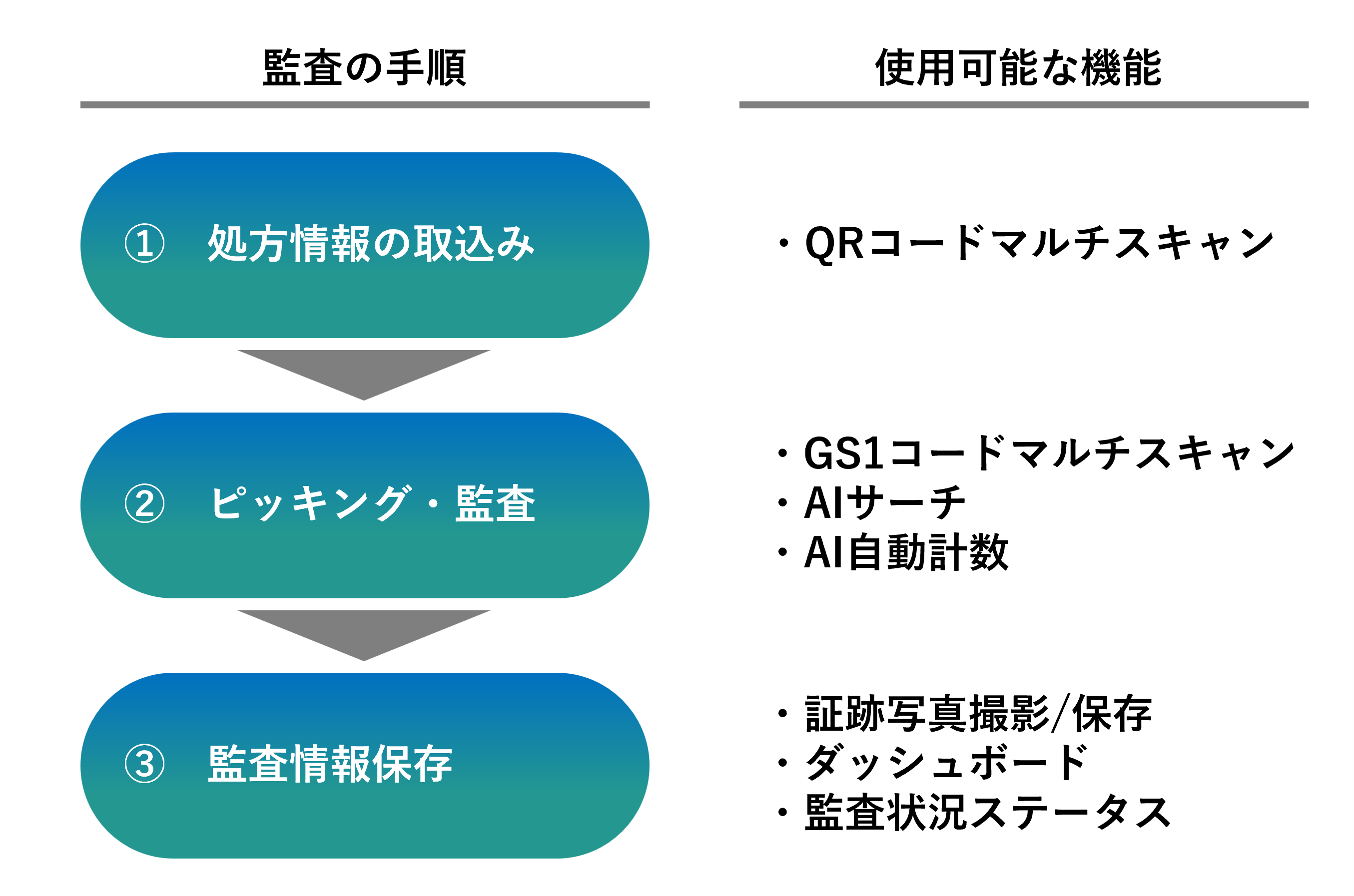 AICE監査は、AIやシステムで薬剤師の判断を置き換えるのではなく、監査に必要な情報と記録を整えることで薬剤師の判断を強化し、確認工程の抜け漏れを減らす「監査支援」サービスです。初期費用無料・低価格の月額で先進機能を一括提供し、調剤業務を強力に補助します。