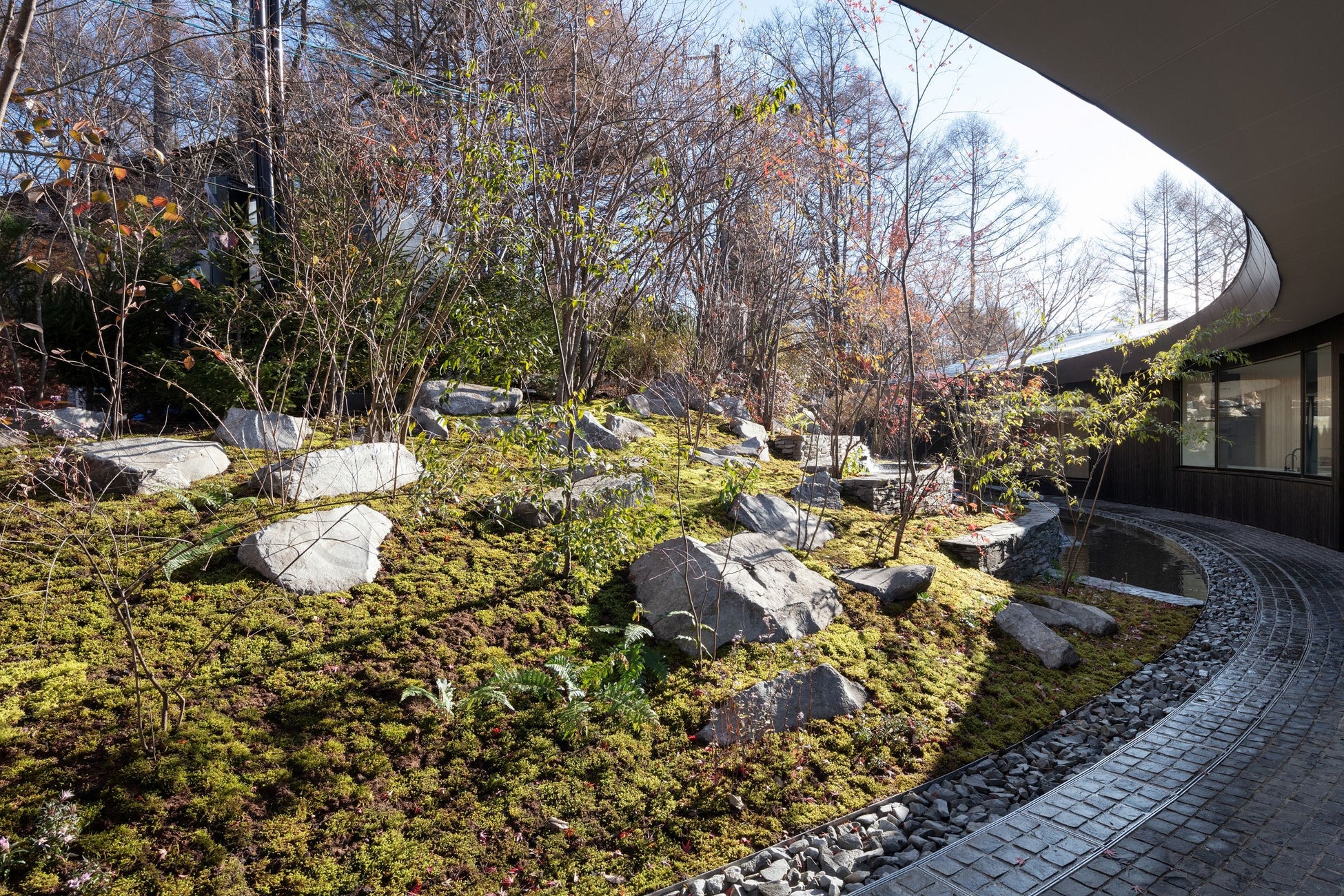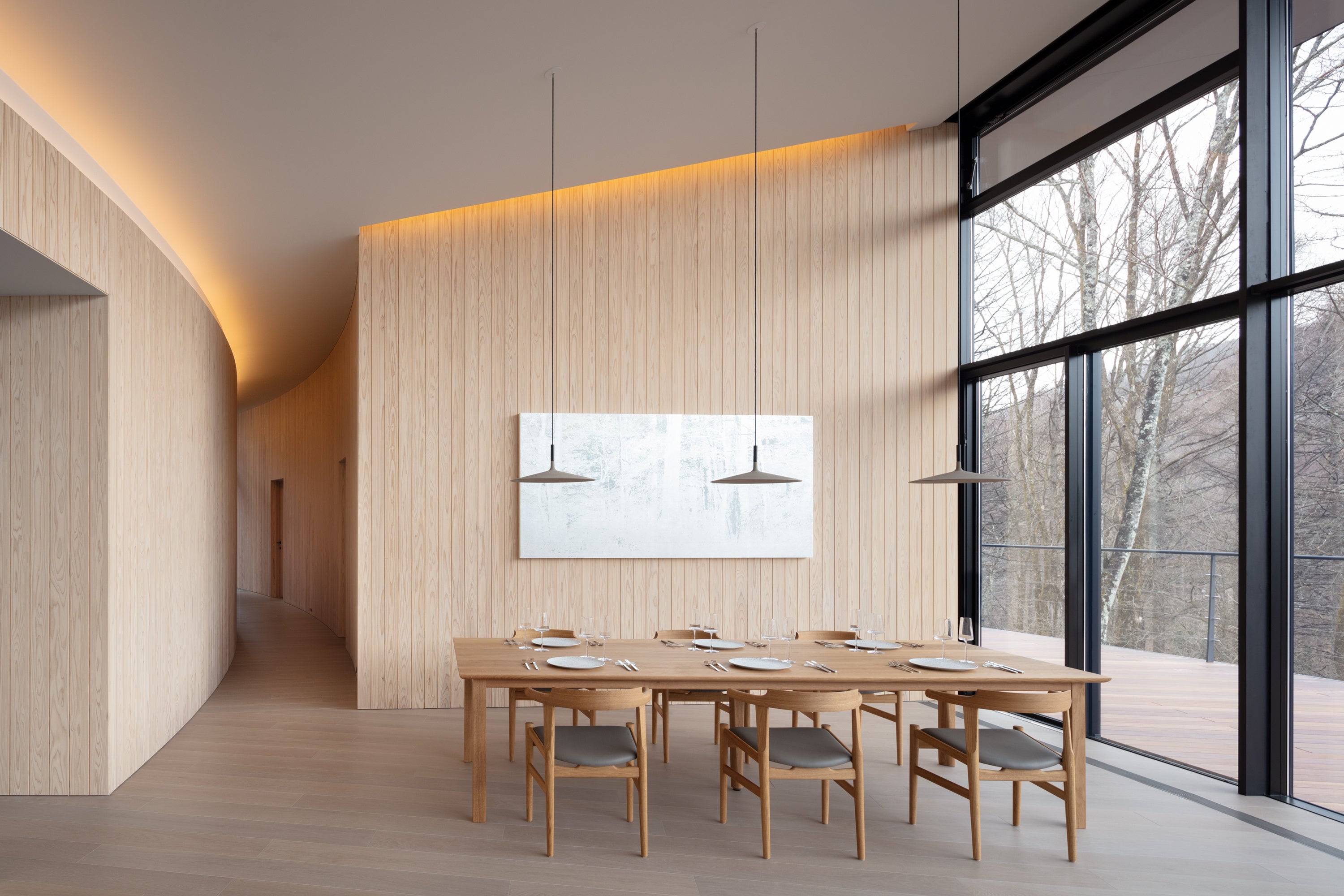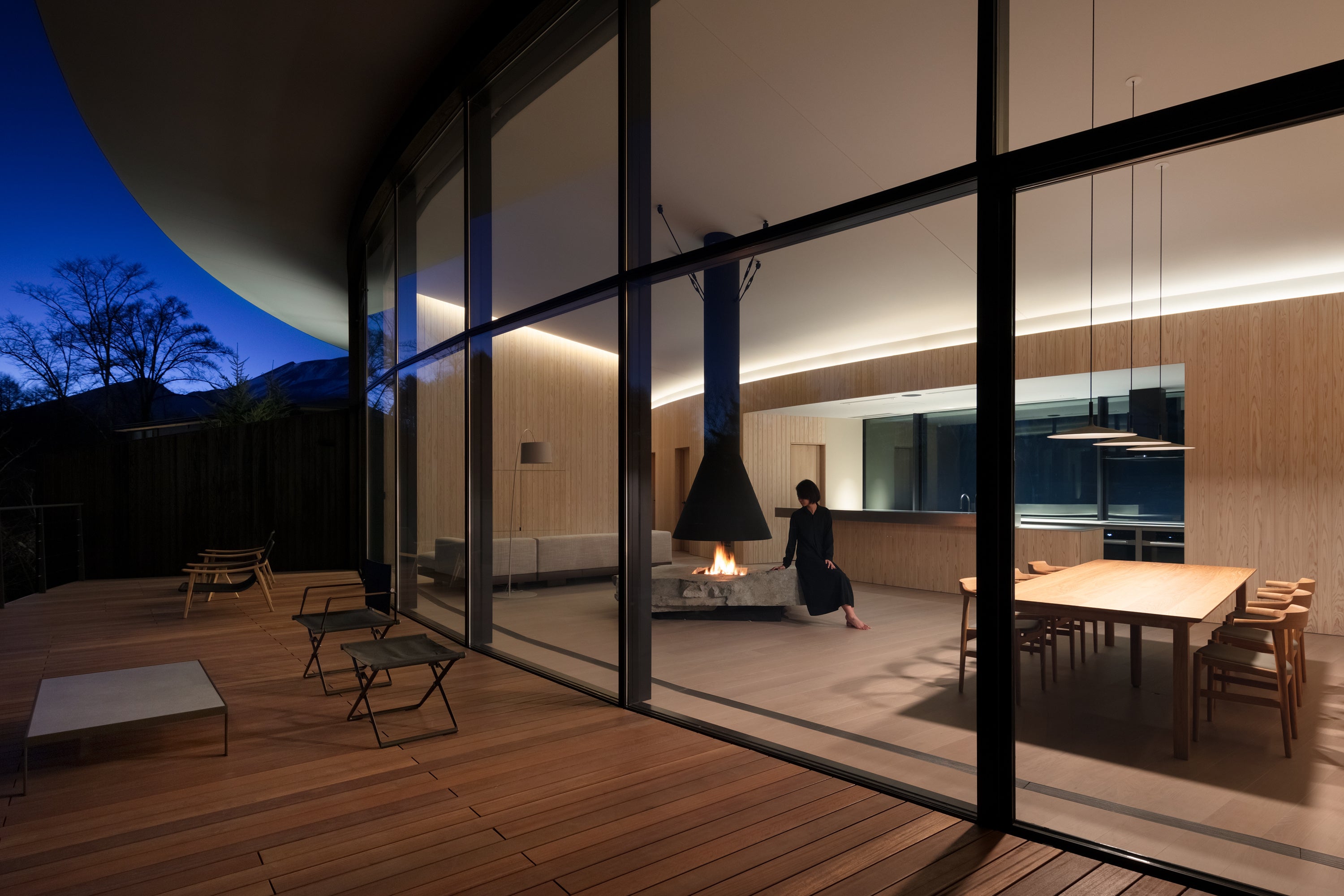 また、木造にスチール梁と一部に最小化した鉄柱を組み合わせることで、15m×12m の大スパンを実現したリビングルームは、弧を描く大開口からは軽井沢の豊かな森と山並みを一望で きます。内部は光を反射する白い曲面天井が空間を柔らかく包み込み、地元で切り出された3トンの安山岩を用いた巨石暖炉が、ホテルと住宅の中間のような静謐で豊かな安らぎの場を演出しました。