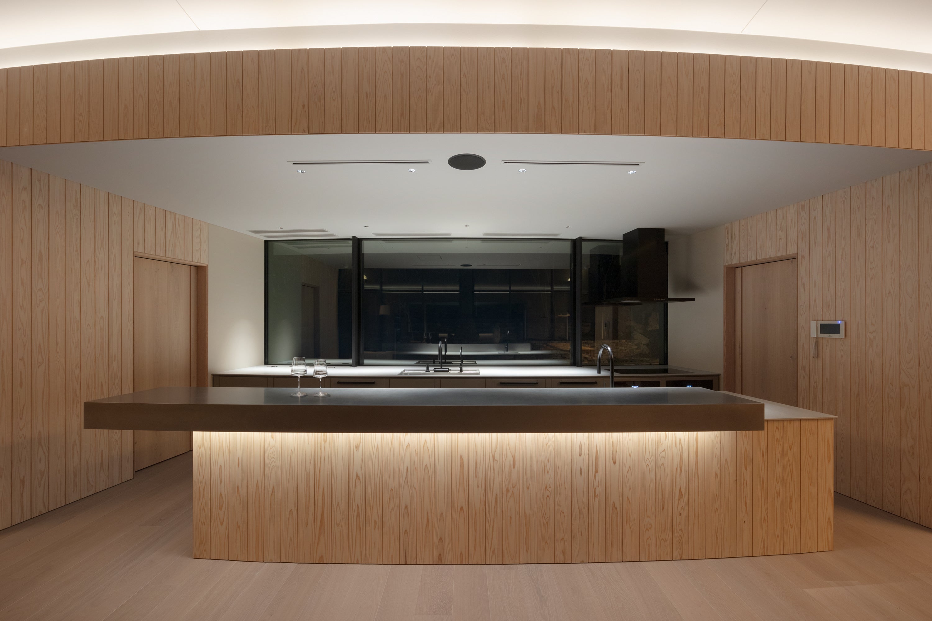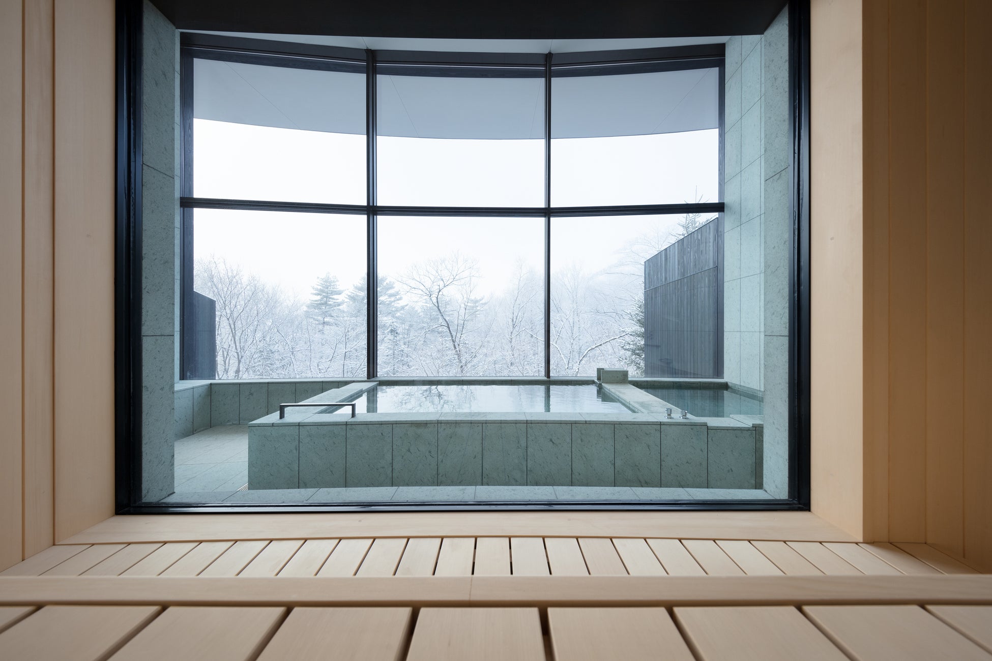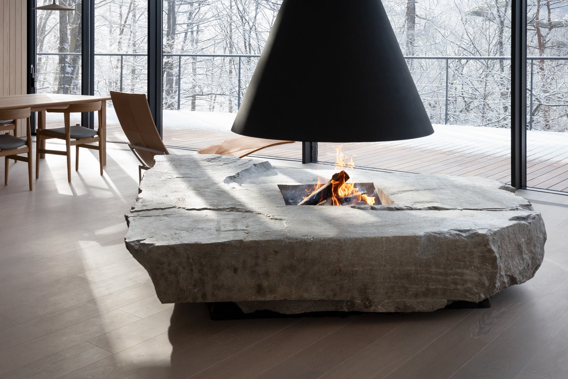 また、木造にスチール梁と一部に最小化した鉄柱を組み合わせることで、15m×12m の大スパンを実現したリビングルームは、弧を描く大開口からは軽井沢の豊かな森と山並みを一望で きます。内部は光を反射する白い曲面天井が空間を柔らかく包み込み、地元で切り出された3トンの安山岩を用いた巨石暖炉が、ホテルと住宅の中間のような静謐で豊かな安らぎの場を演出しました。