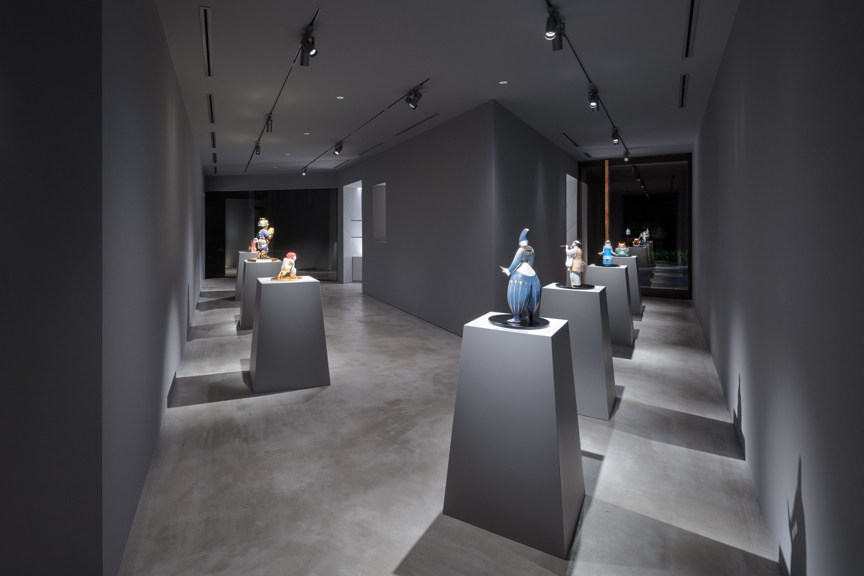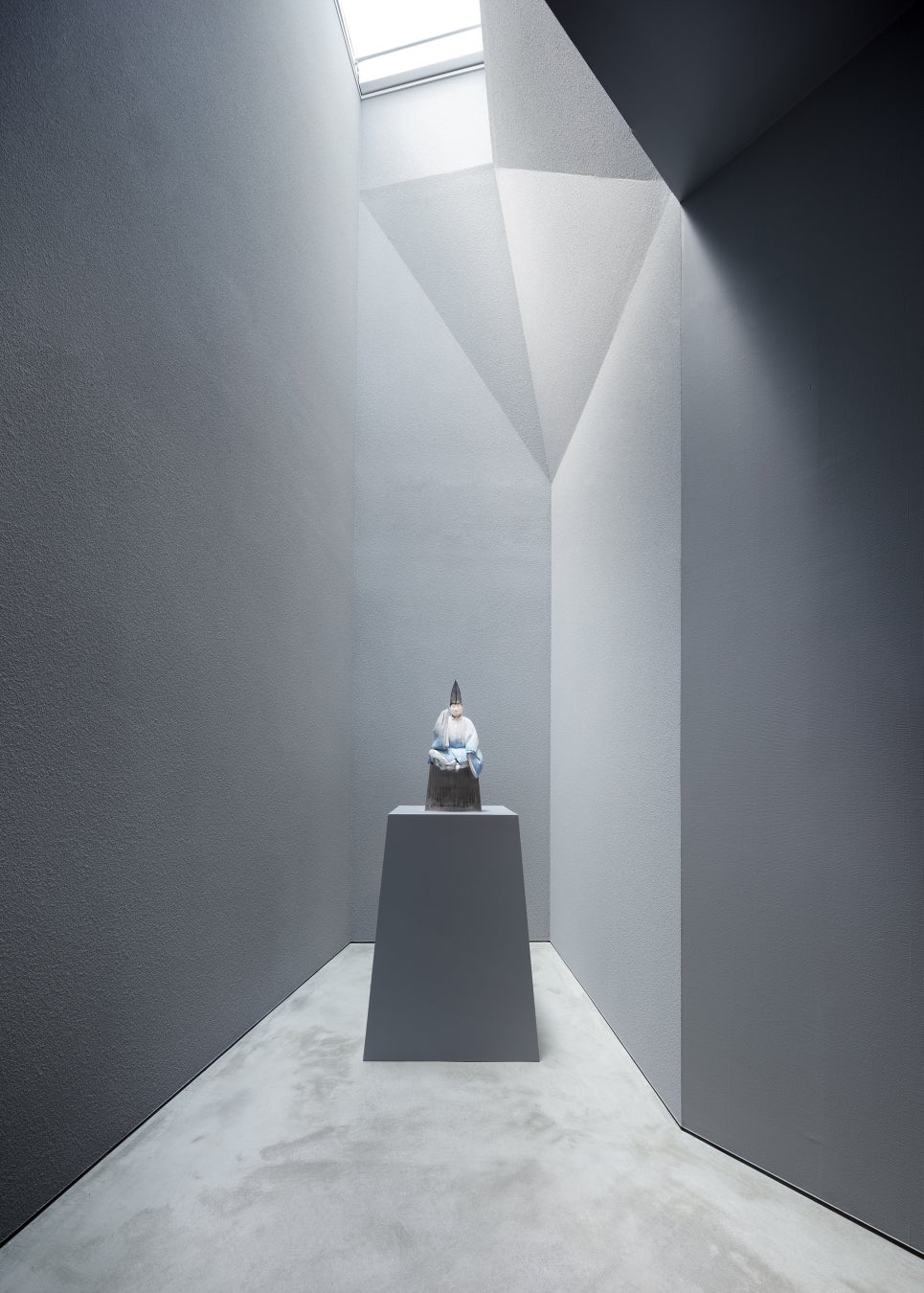 川砂利を用いた伝統技法「掻き落とし」による多面体の擁壁が光を多様に反射し、自然光が人形の表情を引き立てる光の空間を設計しています。伝統技法を現代的な視点で再解釈することで、人形師が未来への祈りを込めた作品と深く対峙できる場を創出しました。