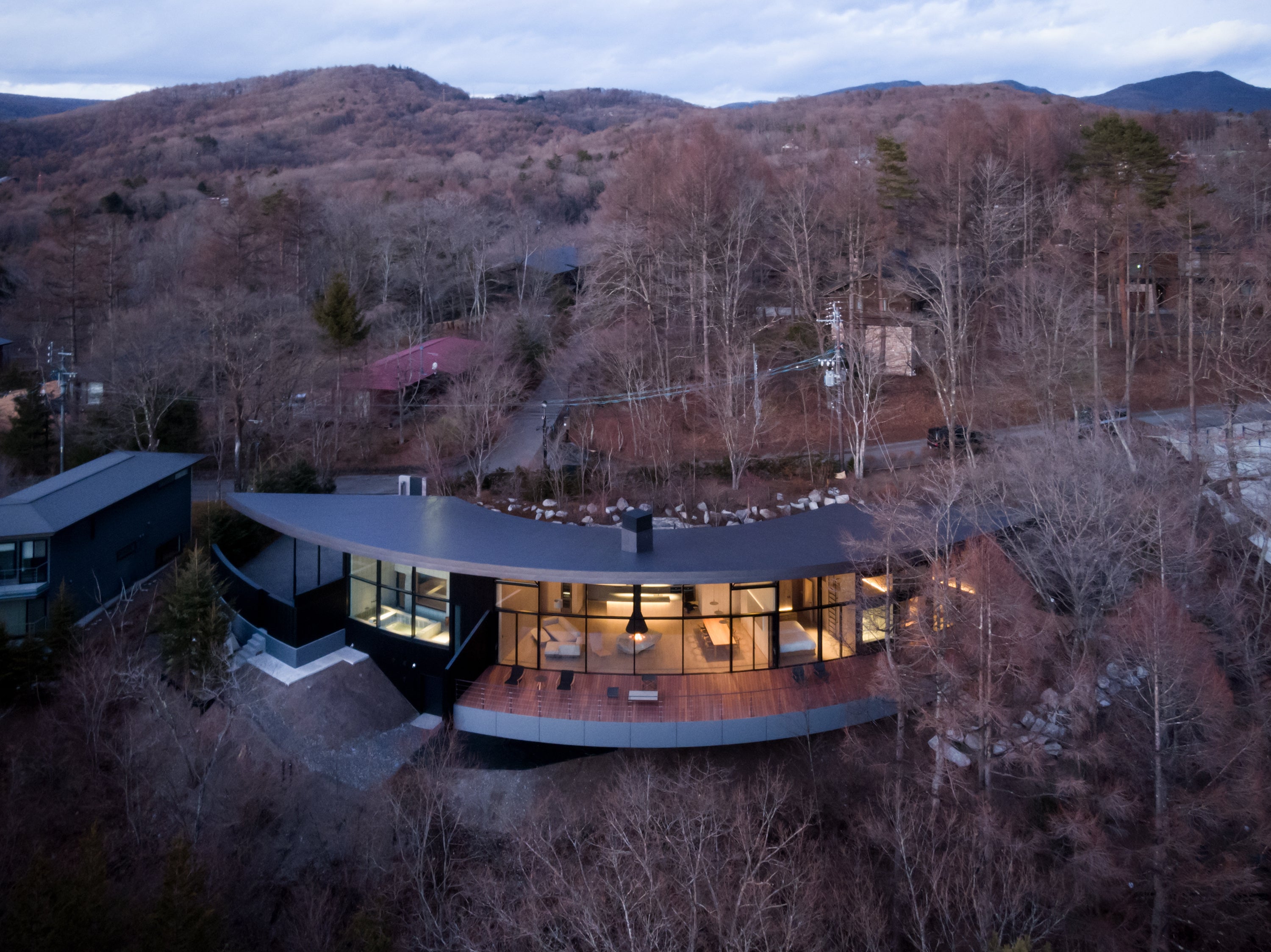 急傾斜の森に浮かぶ「逆円錐形」の別荘です。地表への接地面積を極限まで絞り込むことで環境負荷を抑制しながら、上部に向かって広がる構造により360度のパノラマと光を取り込むことを可能にしました。弧を描く大開口からは軽井沢の豊かな森を一望でき、地元産の安山岩を用いた3トンの巨石暖炉が、静謐で豊かな安らぎの場を演出します。