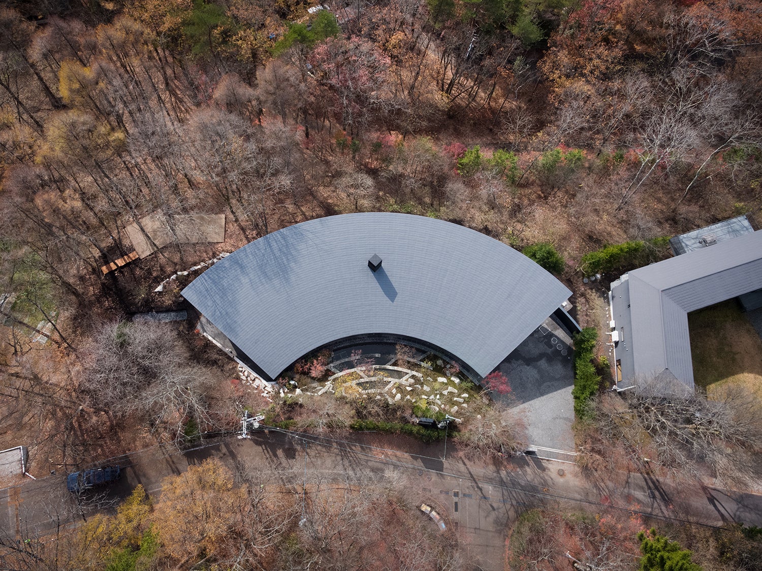 「逆円錐の屋根が光を集め、地形への影響を最小限に抑えながら森へ開かれた空間を実現した。」