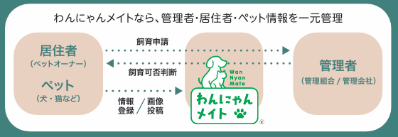 わんにゃんメイト®は、ペット飼育申請およびペットの飼育状況をオンライン化とペーパーレスで一元管理することで、管理会社や管理組合での管理業務を大幅に削減することができる新サービスです。