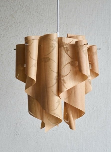 「木板」モデルは、シェードに国産のサクラ材を使用します。天然のサクラ材を極薄にスライスし重ね合わせることで軽やかなカーブを有するスタイルを実現しました。鯛中鯛のデザインとの融合で放つ光は、やわらかくオレンジがかった温かみのある光となり、空間にやすらぎを与えます。また、消灯時には木目の美しさが際立ち、点灯すると木の質感が柔らかく映し出されるなど、点灯時と消灯時で異なる雰囲気を楽しめます。