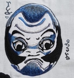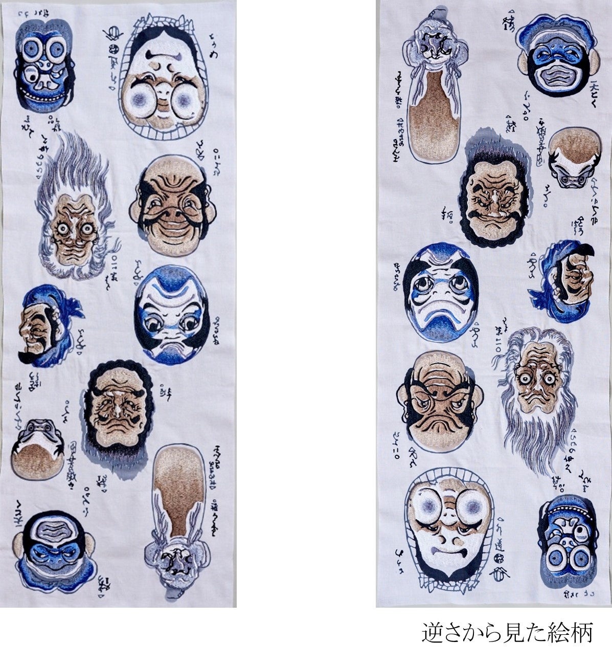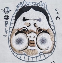 「両面相」は、上下を逆さすると別の絵(顔)に見える「さかさ絵」の一種です。今回、歌川国芳代表作の一つで、おかめ、だるまなどが描かれる図柄を選定しました。裏表両面から見ても顔に見える絵の技術の高さと、絵柄が反転して染まる注染に親和性のある絵柄です。また、三勝が浮世絵シリーズの図柄を注染染めで表現する技術を持っていること、歌川国芳が玄治店(げんやだな)、三勝の本社がある現在の人形町3丁目付近に住んでいたことから、多くの作品を取り扱っていることも選定の理由です。