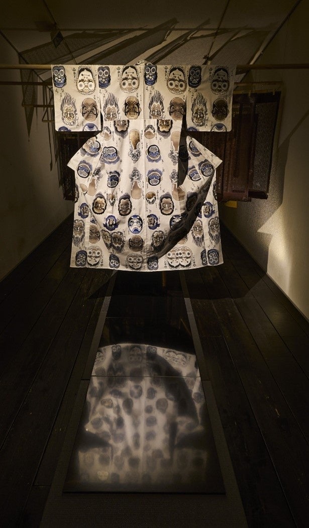 第一弾となる今作は、平織白生地(木綿100%)に、注染染め*で歌川国芳作両面相の浮世絵図柄を描き、加えて、図柄中26カ所を視覚性と高級感をアピールする「刺繍加工」としました。当商品の反物価格は、200万円・税別です。なお、両面相の柄合わせや刺繍の誂えを選び注文いただく商品として、(反物価格100万円から・税別)展開します。
