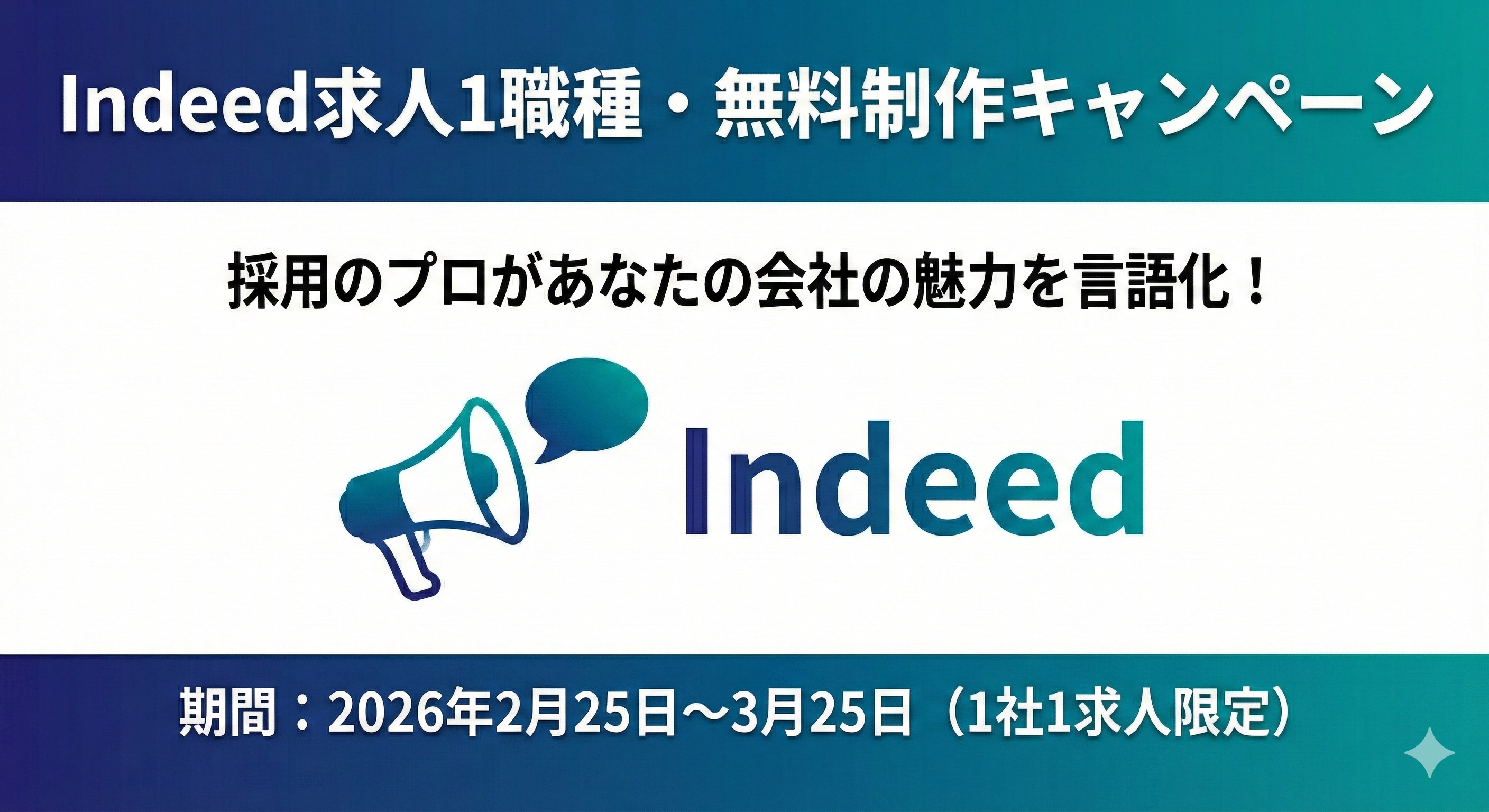 ・内容:採用のプロが貴社の強みをヒアリングし、最適な訴求軸で「Indeed用の求人原稿(1職種分)」を無料で制作いたします。