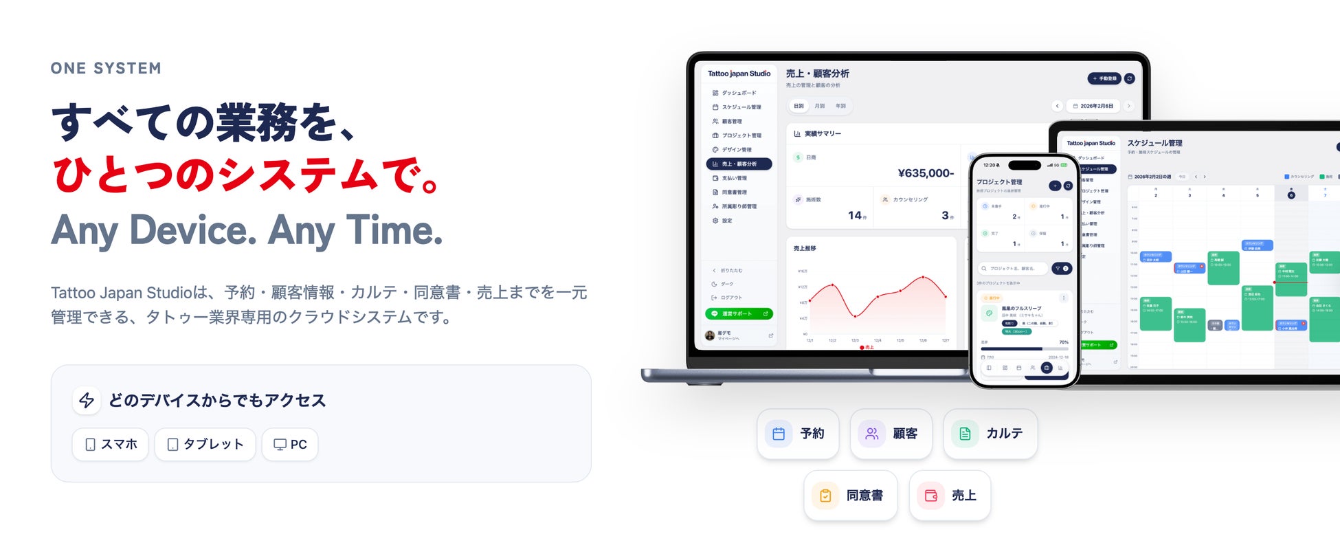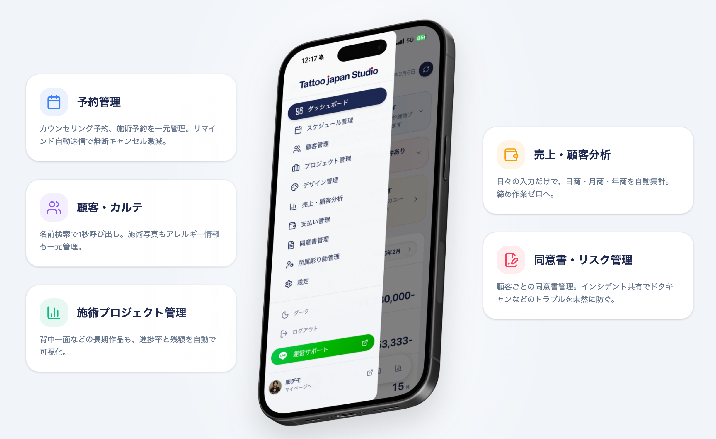 著名人のタトゥーを多く手掛ける彫師・美漸氏を監修に迎えた、業界特化型の顧客管理システム。予約・カルテ・売上を一元化。個人情報への不安軽減に配慮し、アートに没頭できる環境を創出。
