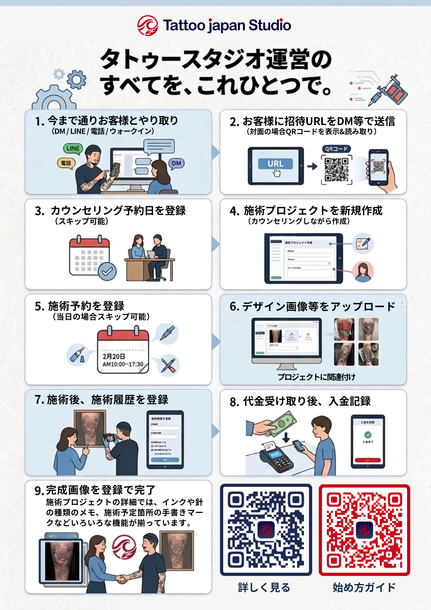 Tattoo Japan Studioは、現在使い慣れているInstagramのDMやLINE、電話でのやり取りを一切変える必要はありません。 集客やコミュニケーションは「今まで通り」のツールで行い、予約が決まったタイミングで本システムから「招待URL」や「QRコード」をお客様に送るだけ。