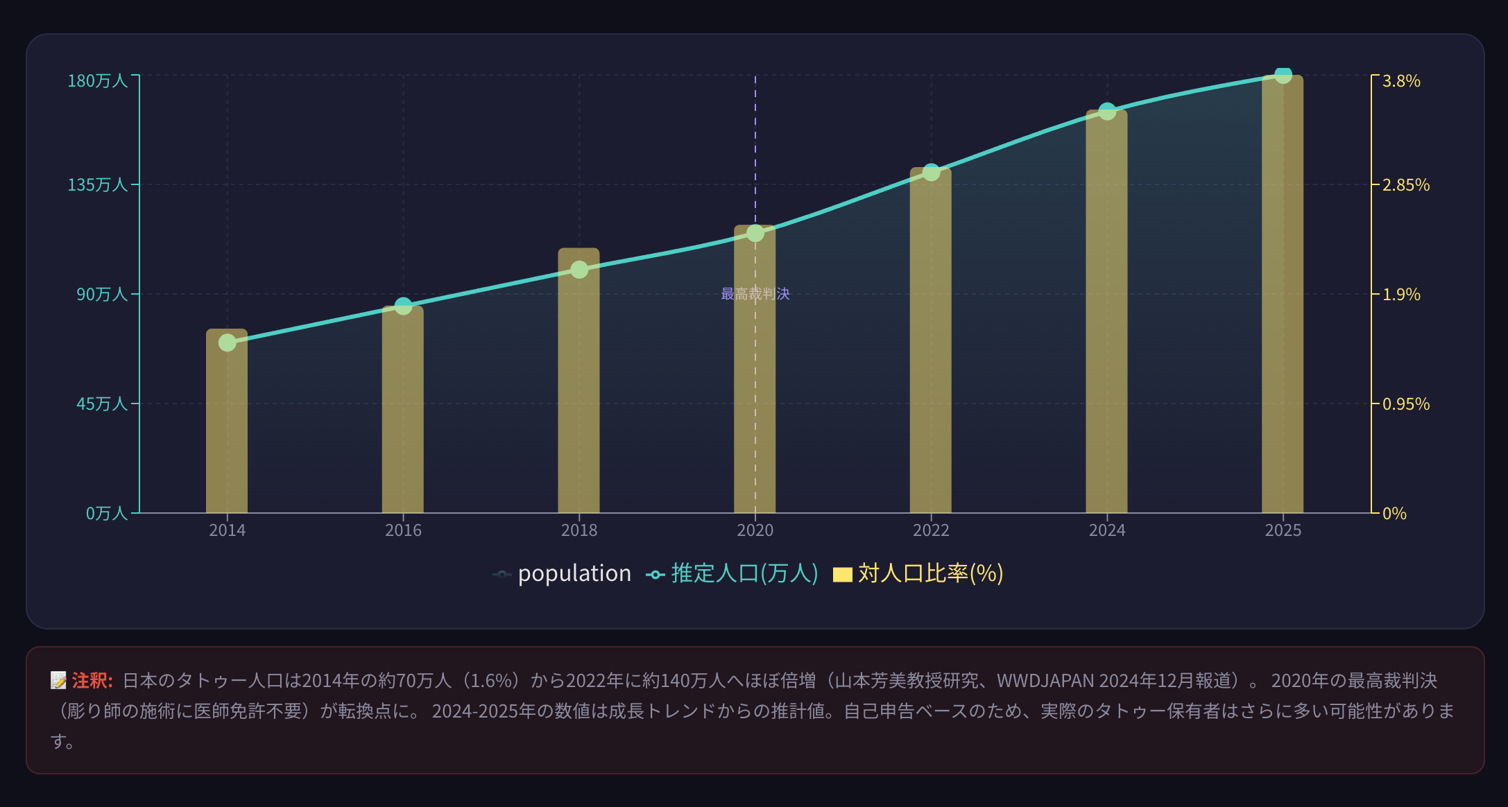 2020年の最高裁判決(医師免許不要)などを機に、日本のタトゥー業界は大きな転換点を迎えました。日本のタトゥー人口はこの8年間で約70万人から約140万人へと倍増し、2025年には推計約180万人へとさらなる急成長を遂げています。