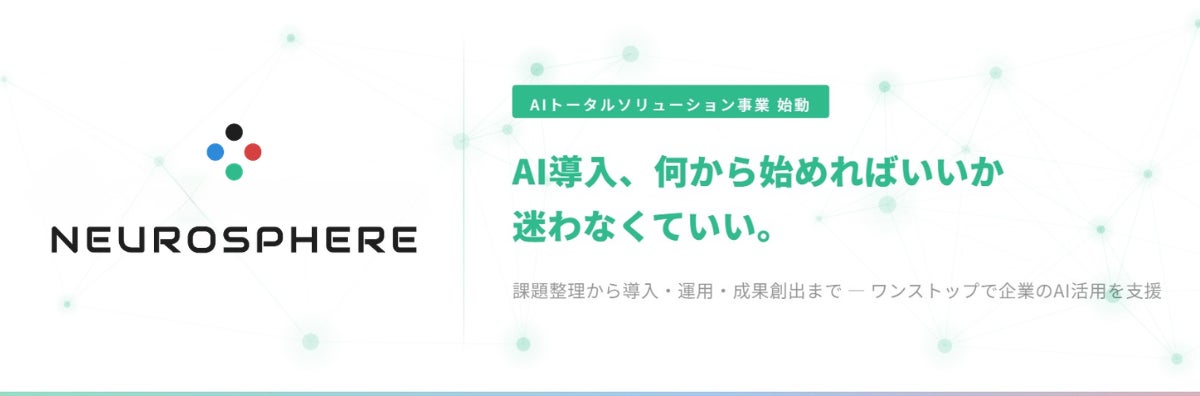 株式会社Neurosphere(本社:東京都港区西新橋1-6-12アイオス虎ノ門4階、代表取締役:根来 実、以下「Neurosphere」)は、企業のAI導入における課題提起から、最適なAIサービスの選定・導入実施・運用伴走・成果創出までを一気通貫で支援する「AIトータルソリューション事業」を開始いたします。
