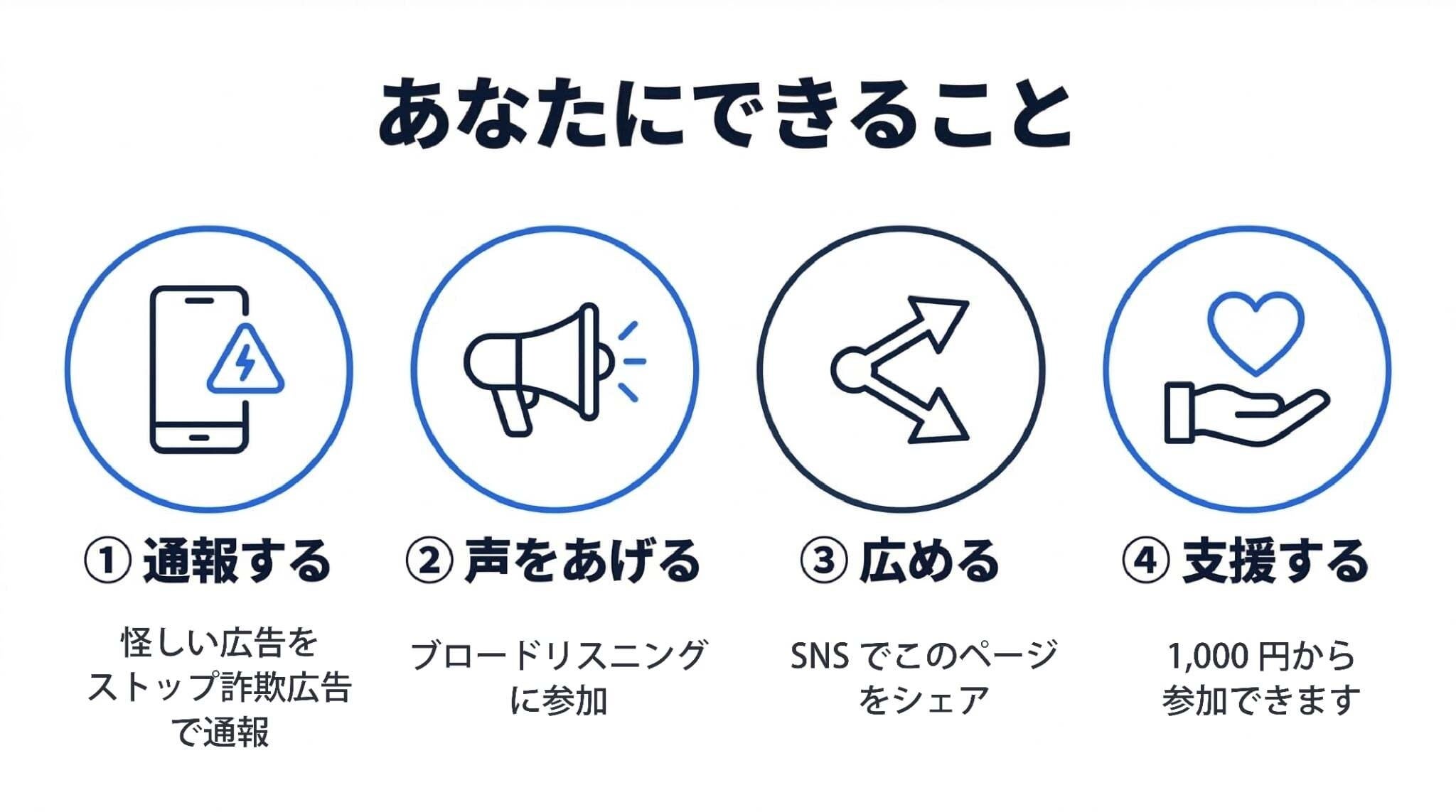 広める:このプレスリリースやプロジェクトの情報をSNSでシェアしてください。一人でも多くの人がこの問題を知ることが、被害を減らす第一歩です。シェアの際はぜひ #ストップ詐欺広告 をつけてください。