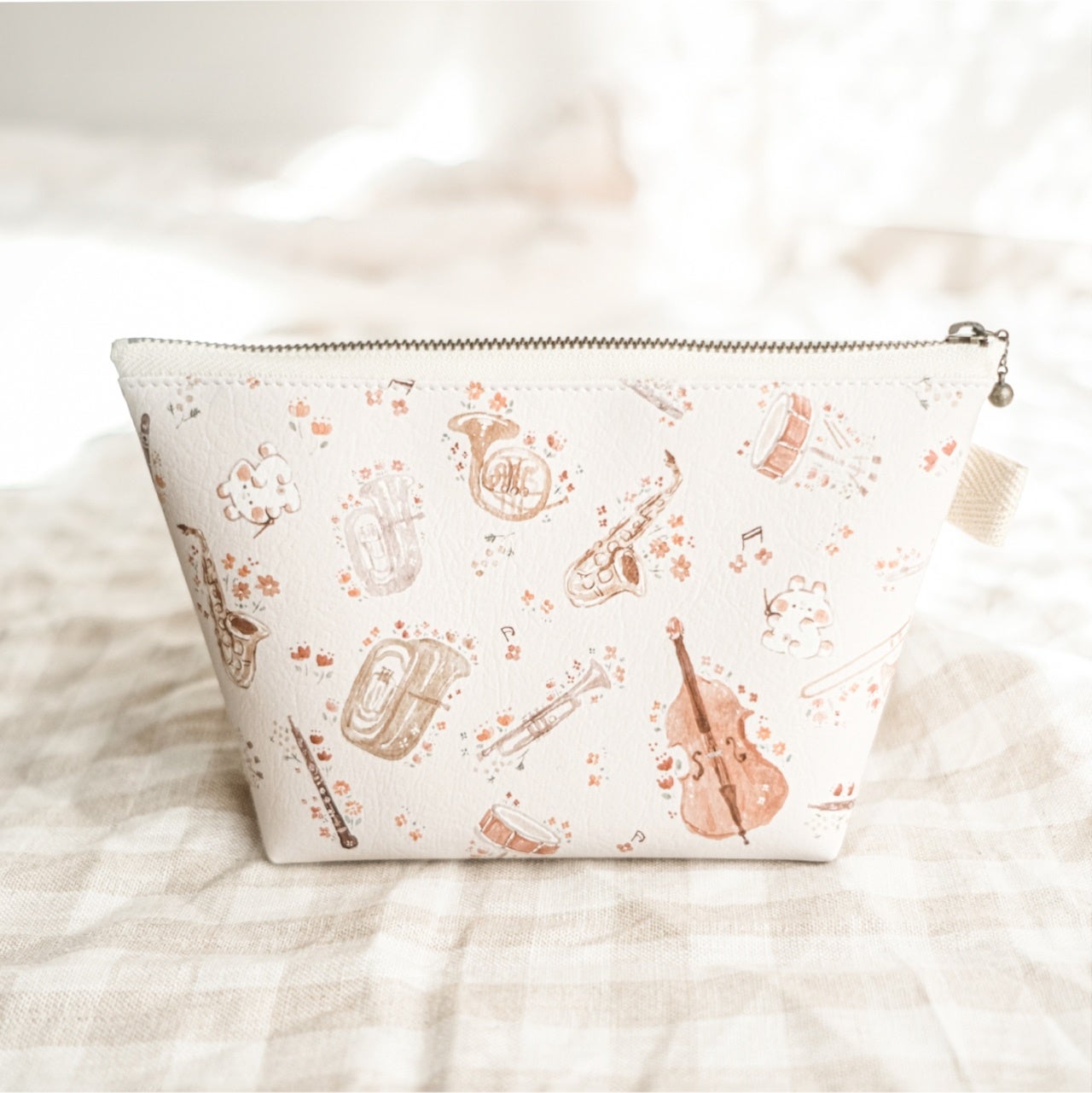 水彩風の楽器とお花、ワンポイントのうさぎが可愛い人気シリーズです。イラストレーターmomochyの吹奏楽とオーケストラの経験を活かし、チューナーが入るサイズの「三角ポーチ」など、楽器練習にもぴったりなグッズをご用意しております。