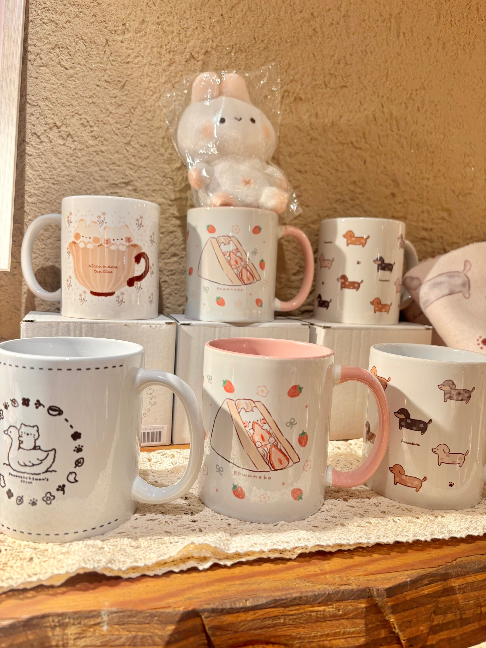 【ももぽわスワン】新規オープンに合わせて制作した新たなシリーズです。吉祥寺には素敵なカフェが多いことや、自然豊かな井の頭公園、人気のスワンボート、りすに出会える自然文化園などをイメージしたモチーフを散りばめてデザインしました。「ももちーうさぎ」と「ぽわねこ」がスワンに乗ってお散歩する様子を、ぜひお手に取ってお楽しみください。