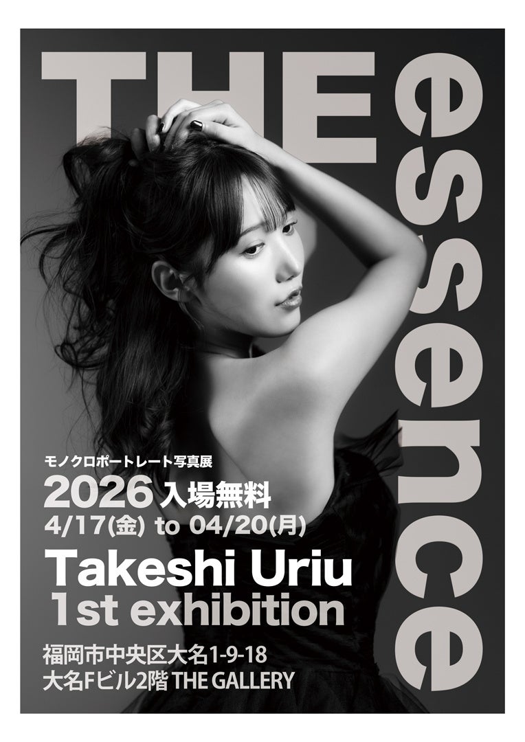 福岡出身・福岡拠点の写真家/商業カメラマン Takeshi Uriu(うりうたけし)は、モノクロポートレートシリーズ『THE essence』の初個展(写真展)を、2026年4月17日(金)〜4月20日(月)、福岡市中央区大名「THE GALLERY」にて開催します。