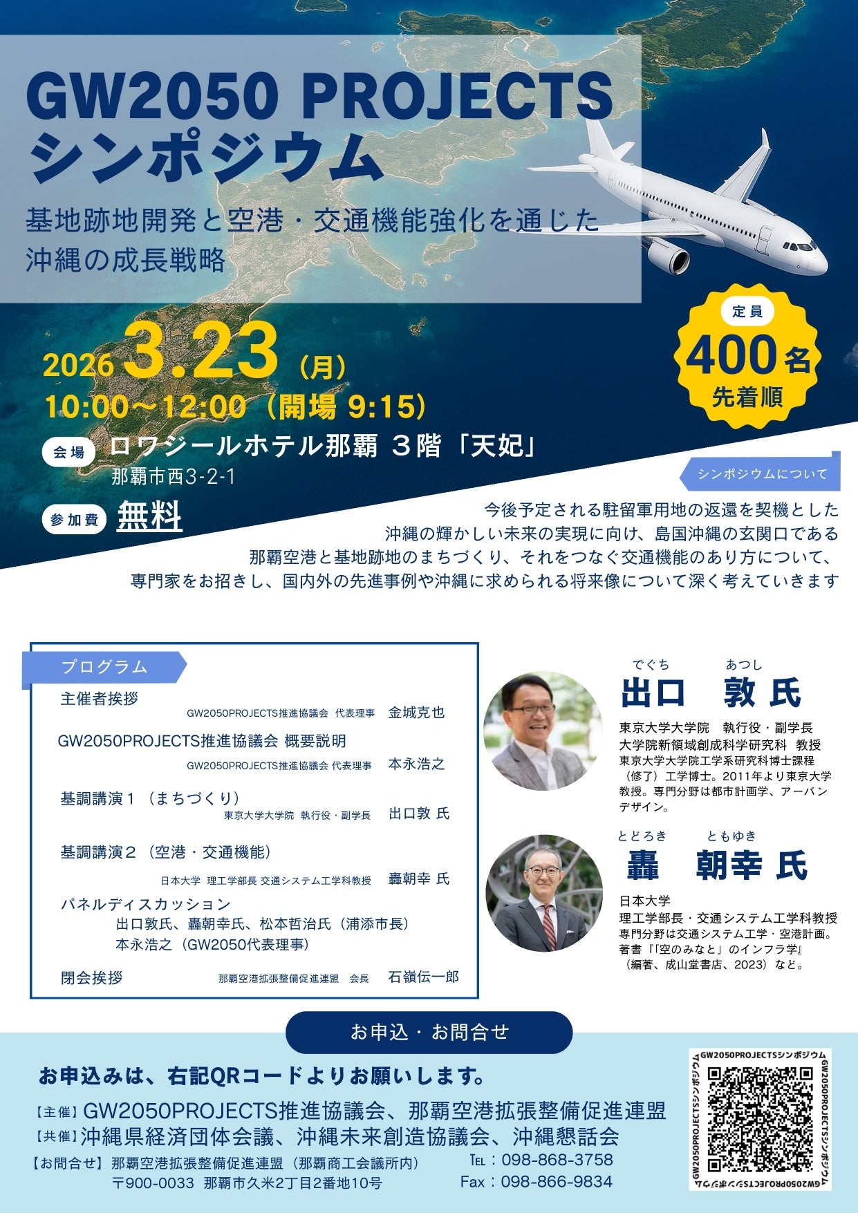GW2050PROJECTS推進協議会、那覇空港拡張整備促進連盟(事務局:那覇商工会議所)では、令和8年3月23日(月)ロワジールホテル那覇(3階天妃の間)にて、「GW2050PROJECTSシンポジウム ~基地跡地開発と空港・交通機能強化を通じた沖縄の成長戦略~」を開催いたします。