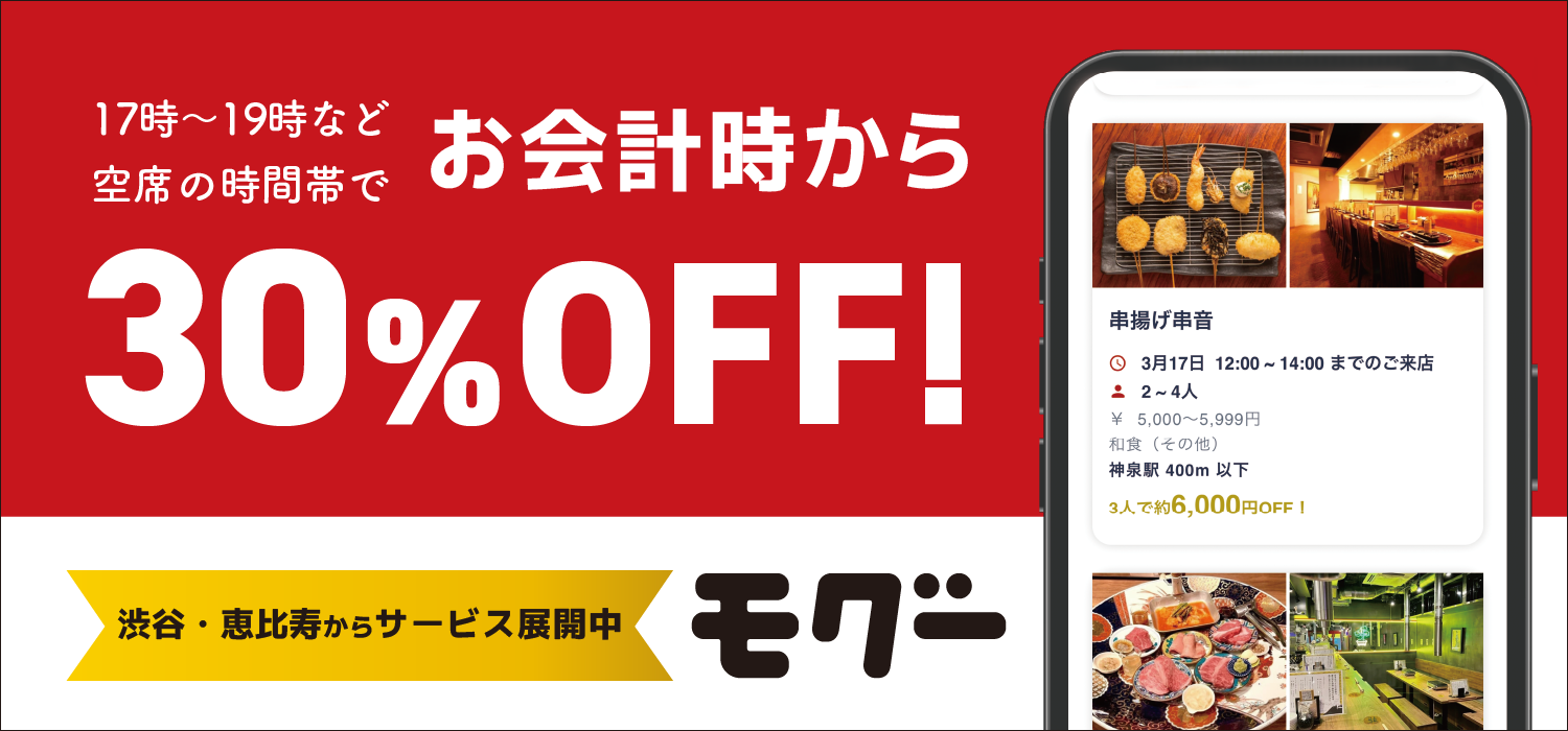 株式会社Moguu(本社:東京都渋谷区、代表取締役社長:ソールズベリー夏生)は、飲食店の空席とユーザーをお得にマッチングするサービス「モグー」のβ版を、渋谷・恵比寿エリアで提供開始したことをお知らせします。現在、同エリアの飲食店約60店舗が加盟しており、ユーザーは対象店舗を「モグー」経由で予約・来店すると、お会計から一律30%OFFの割引を受けることができます。