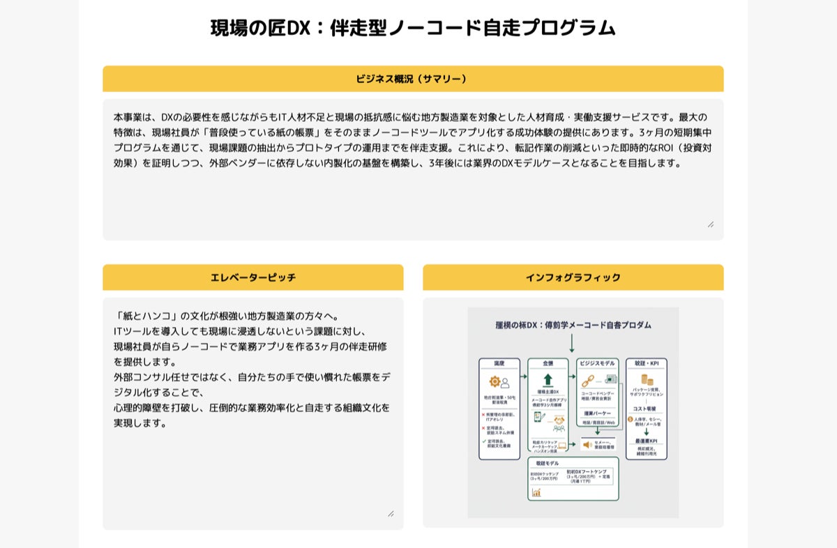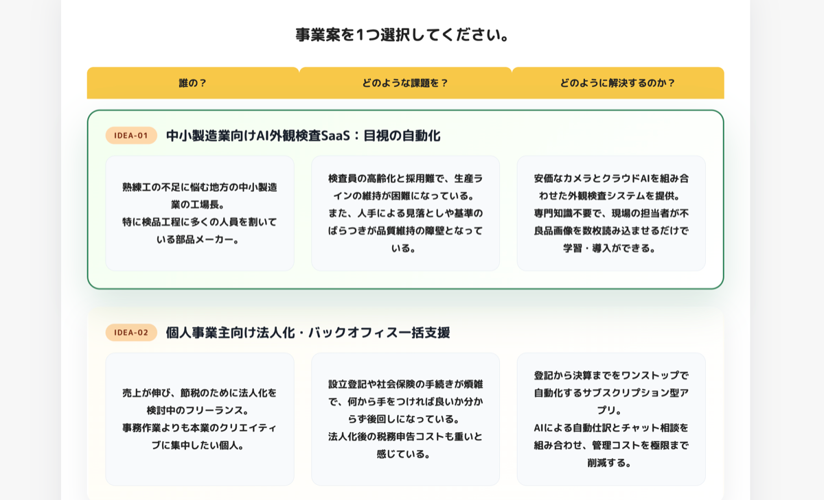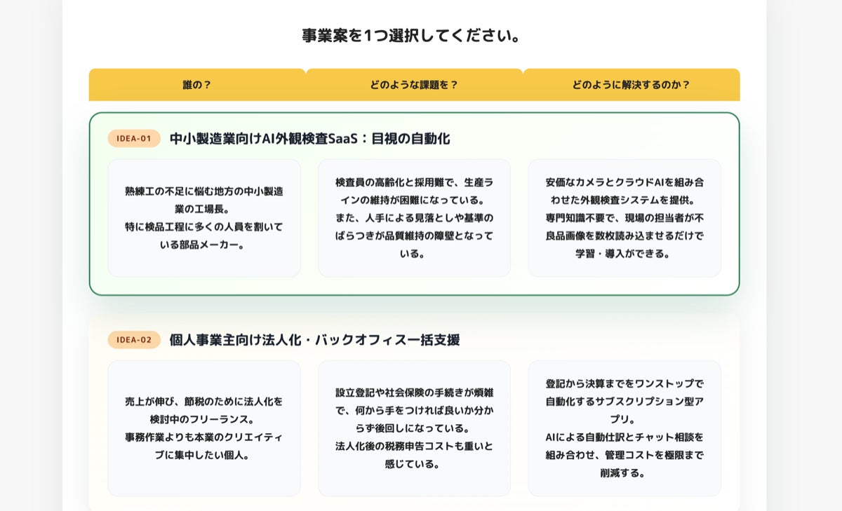 あなたのアイデアが「説得力ある企画書」に。選択した事業アイデアを基に、これらの資料をAIが自動生成します。