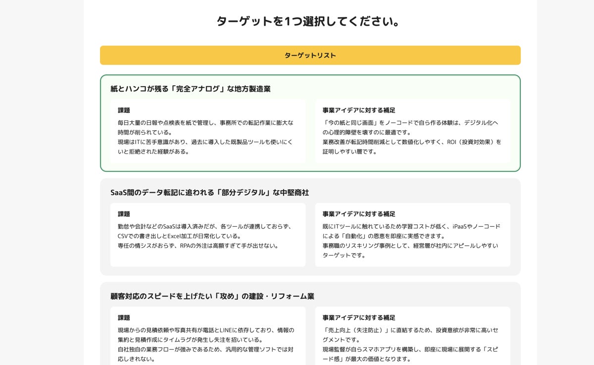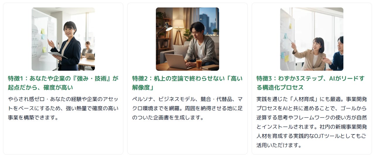 ・新規事業開発の担当者:強みや技術を活かしたアイデア出し〜資料作成までの工数を削減したい方。