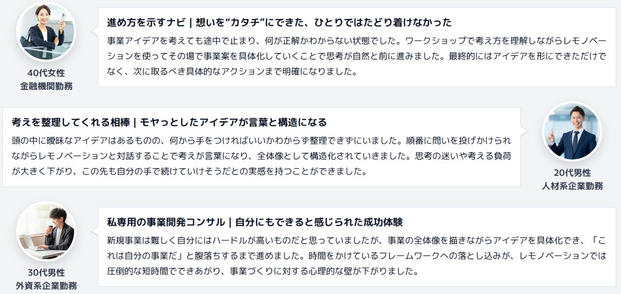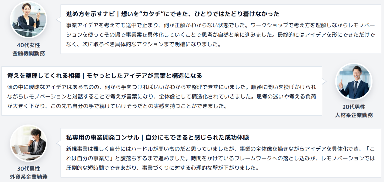 そこで当社は、新規事業開発を支援してきた知見をAIツールとして体系化。ただアイデアを出すだけでなく、「稼げるゴール」から逆算し、事業化への最短ルートを提示する事業創出AI『Lemonovation(レモノベーション)』を開発いたしました。