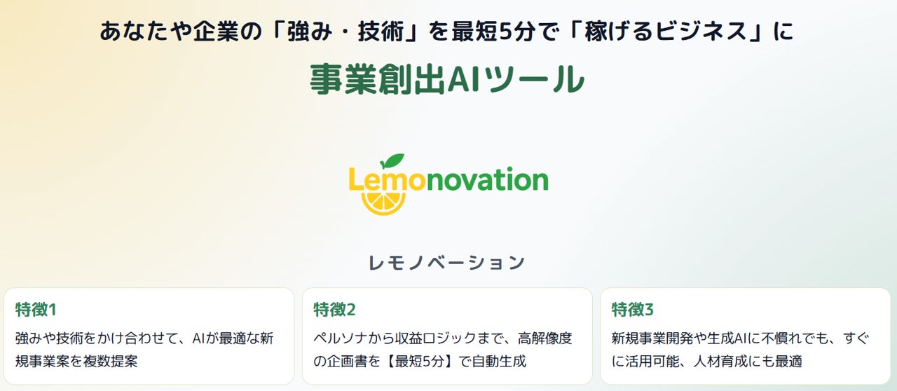 【無料モニター募集】事業創出AI『Lemonovation(レモノベーション)』β版の提供を開始 ~企業やあなたの「強み・技術」を最短5分で「稼げる新規事業アイデア」に変える~