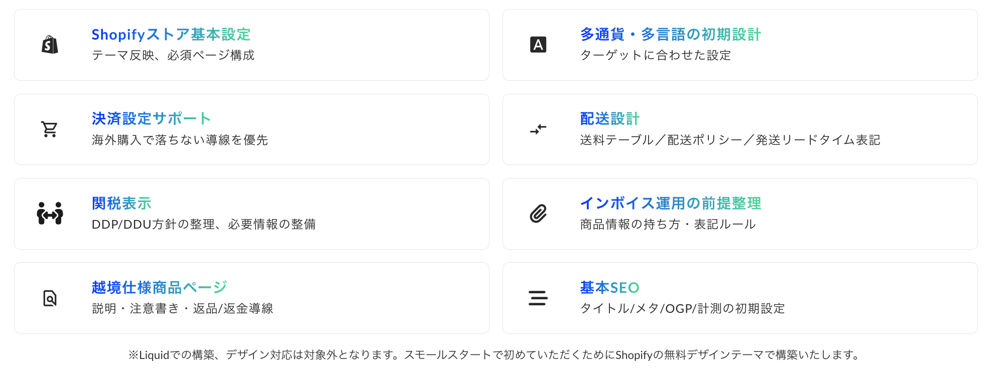 Shopifyの越境設定はMarkets・税/関税設定・決済・配送が連動しています。「構築だけ」「デザインだけ」ではなく、購入体験として破綻しない形でストア全体を組み上げます。チェックアウトでの関税・輸入税の表示・徴収機能(DDP対応)の前提条件も含め、包括的に設計します。