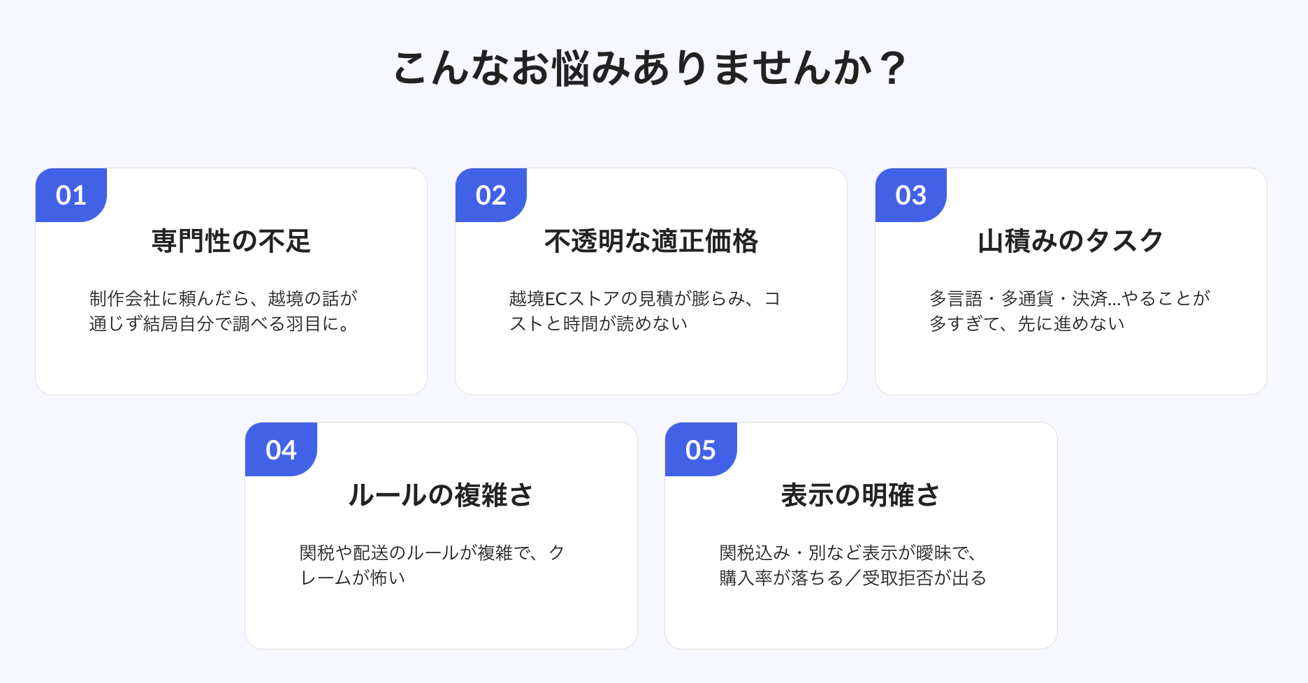 越境ECへの関心は高まる一方、実際に踏み出せない事業者が多い現状があります。その主な原因として、専門知識の不足・適正価格の不透明さ・関税や配送ルールの複雑さが挙げられます。制作会社に依頼しても越境特有の論点が共有されず、結局自社で調べ直すケースも少なくありません。