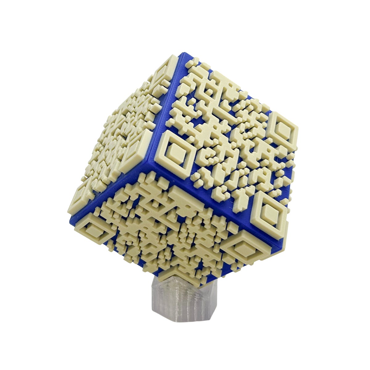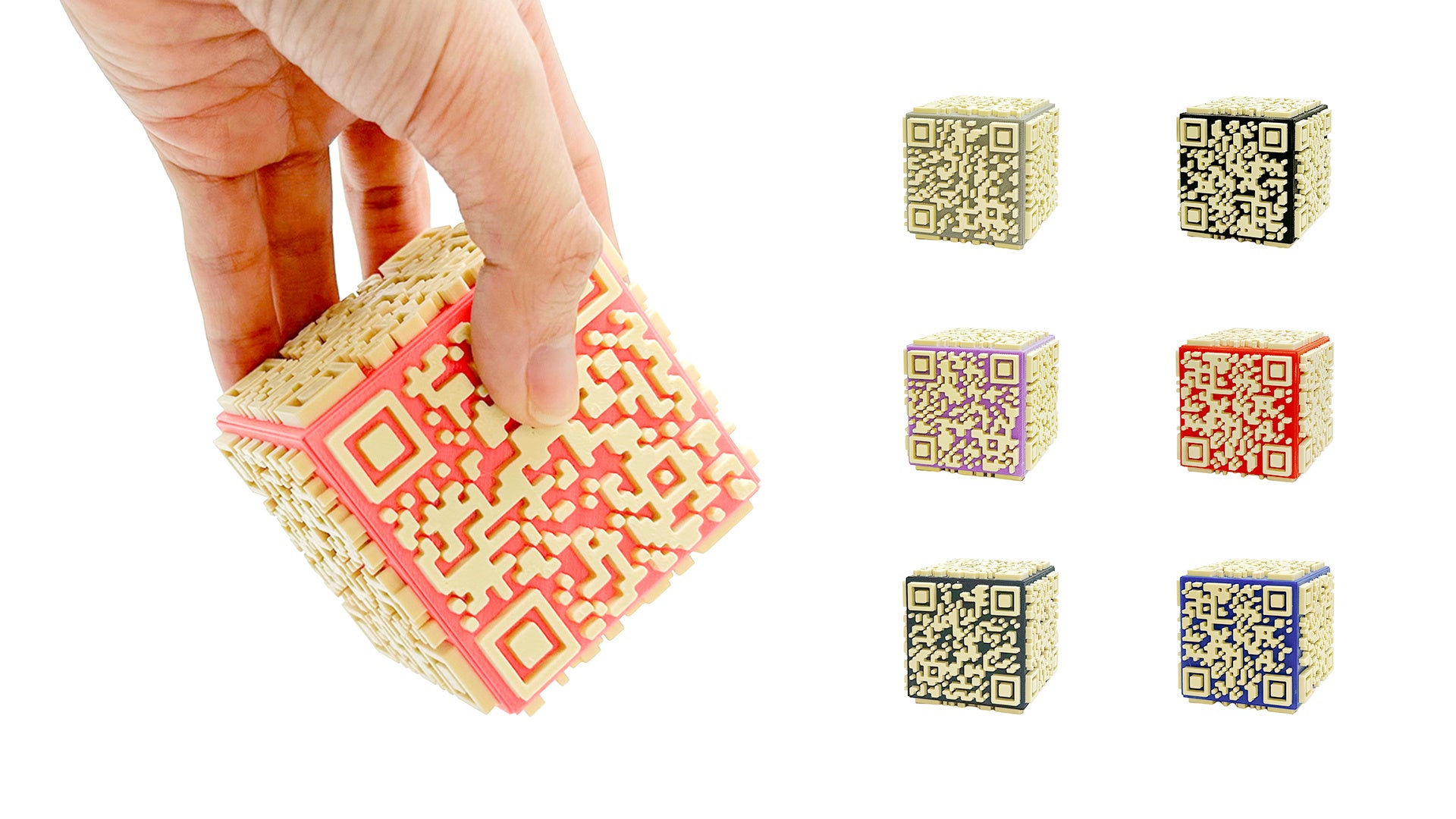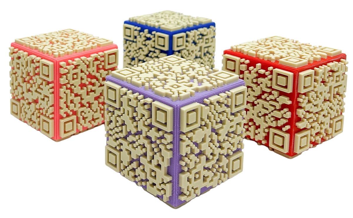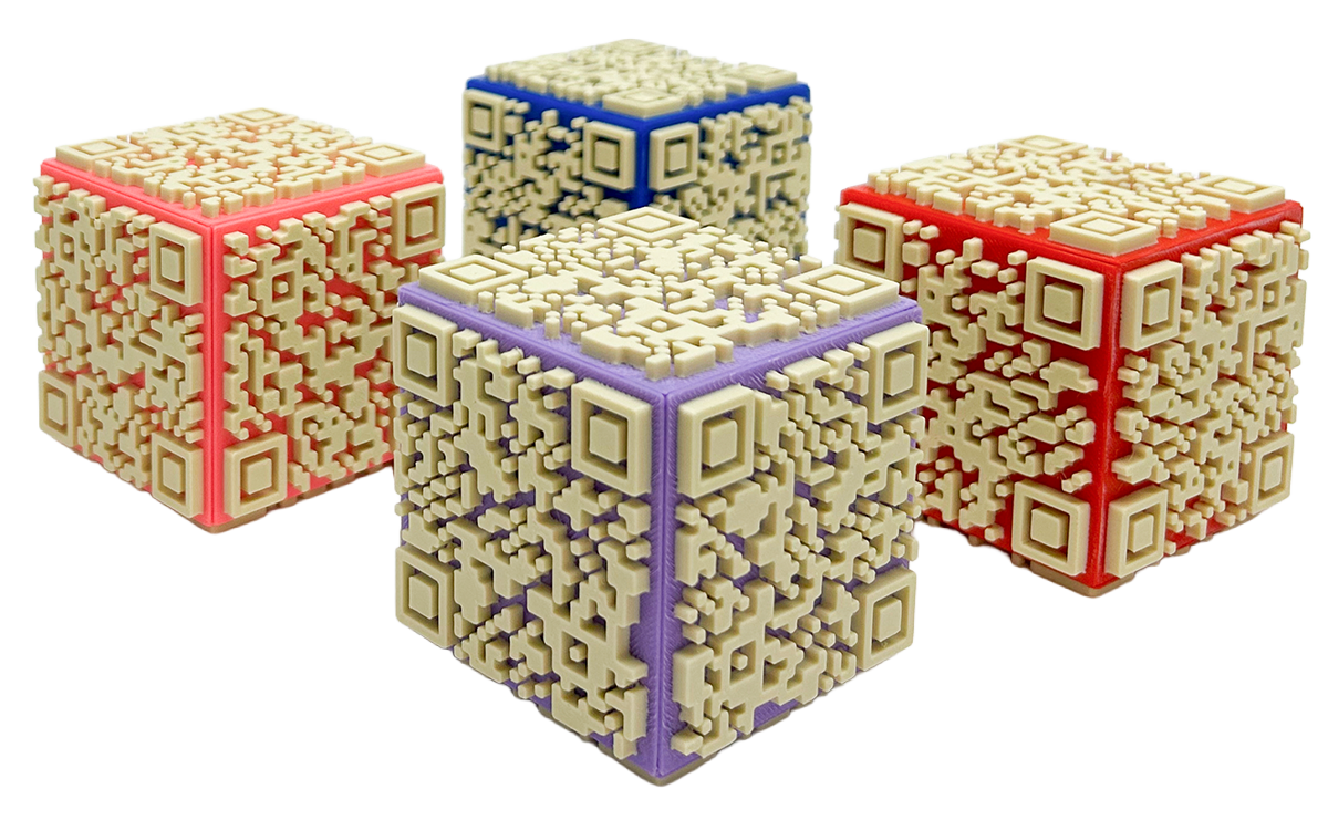 情報への入口として日常的に目にしているQRコードを、平面ではなく空間の中で成立させることはできないか。そうした試行錯誤の末に生まれたのが、六面すべてにQRコードを配置した立体型のオブジェです。