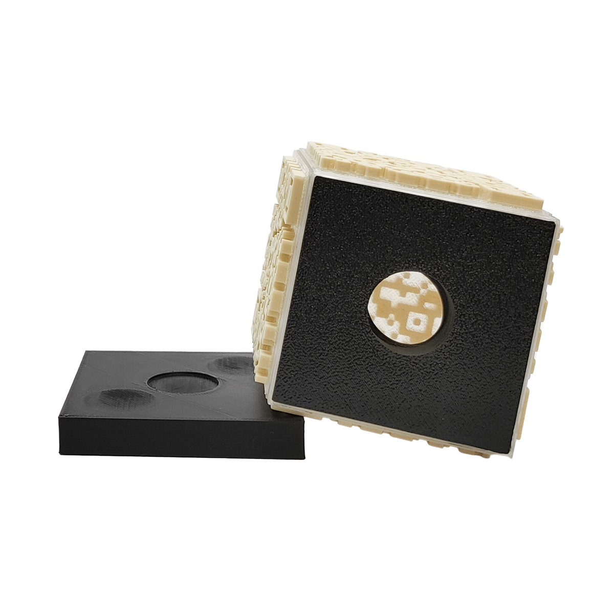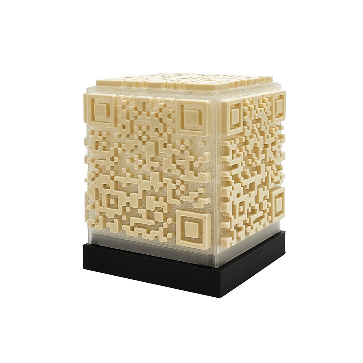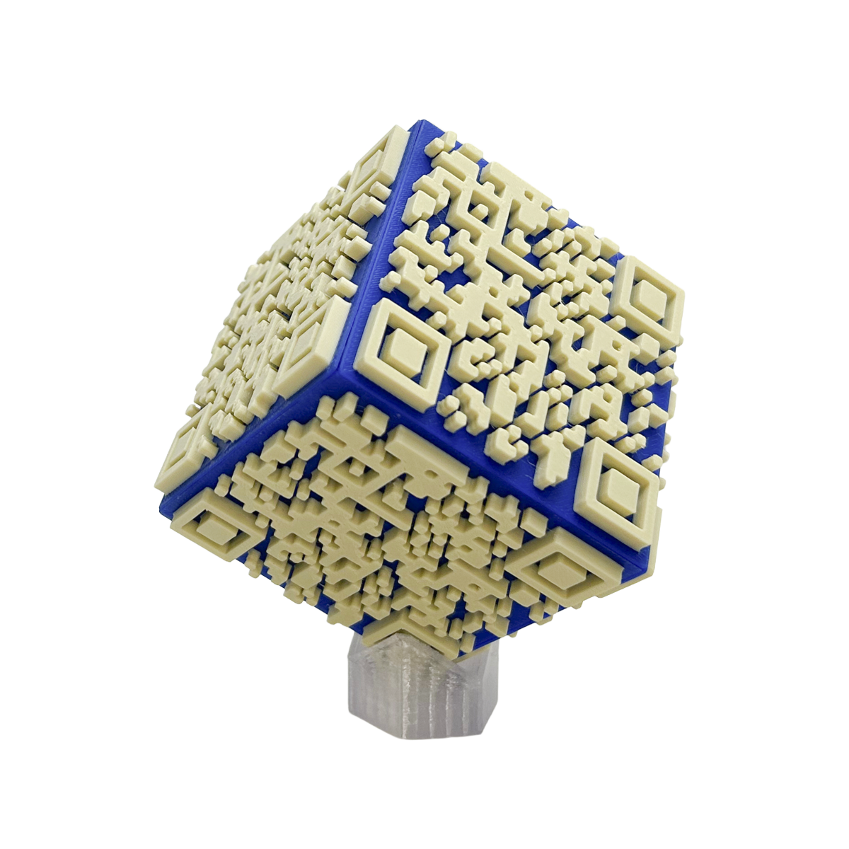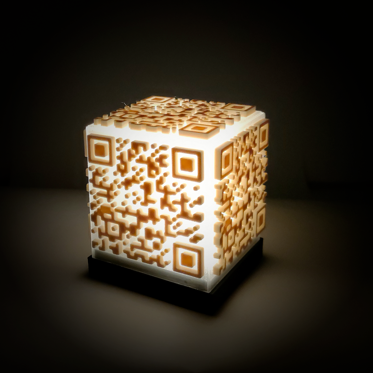 情報への入口として日常的に目にしているQRコードを、平面ではなく空間の中で成立させることはできないか。そうした試行錯誤の末に生まれたのが、六面すべてにQRコードを配置した立体型のオブジェです。