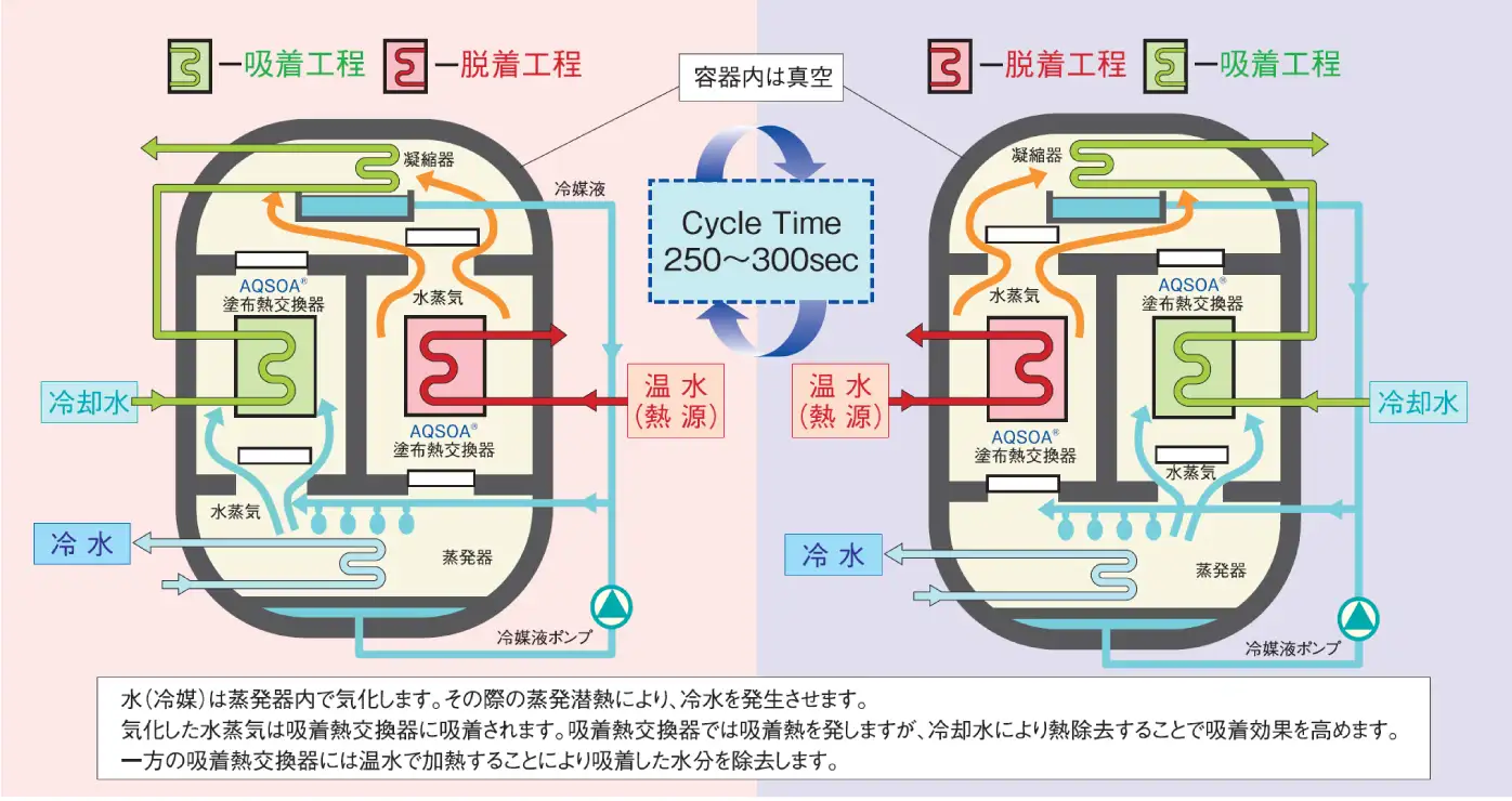POLASTECHのAHPシステムは、この低温排熱を直接エネルギー源として活用できる点が最大の特長です。従来の電力依存型冷却方式とは異なり、排熱そのものを駆動源として冷熱へ転換することで、