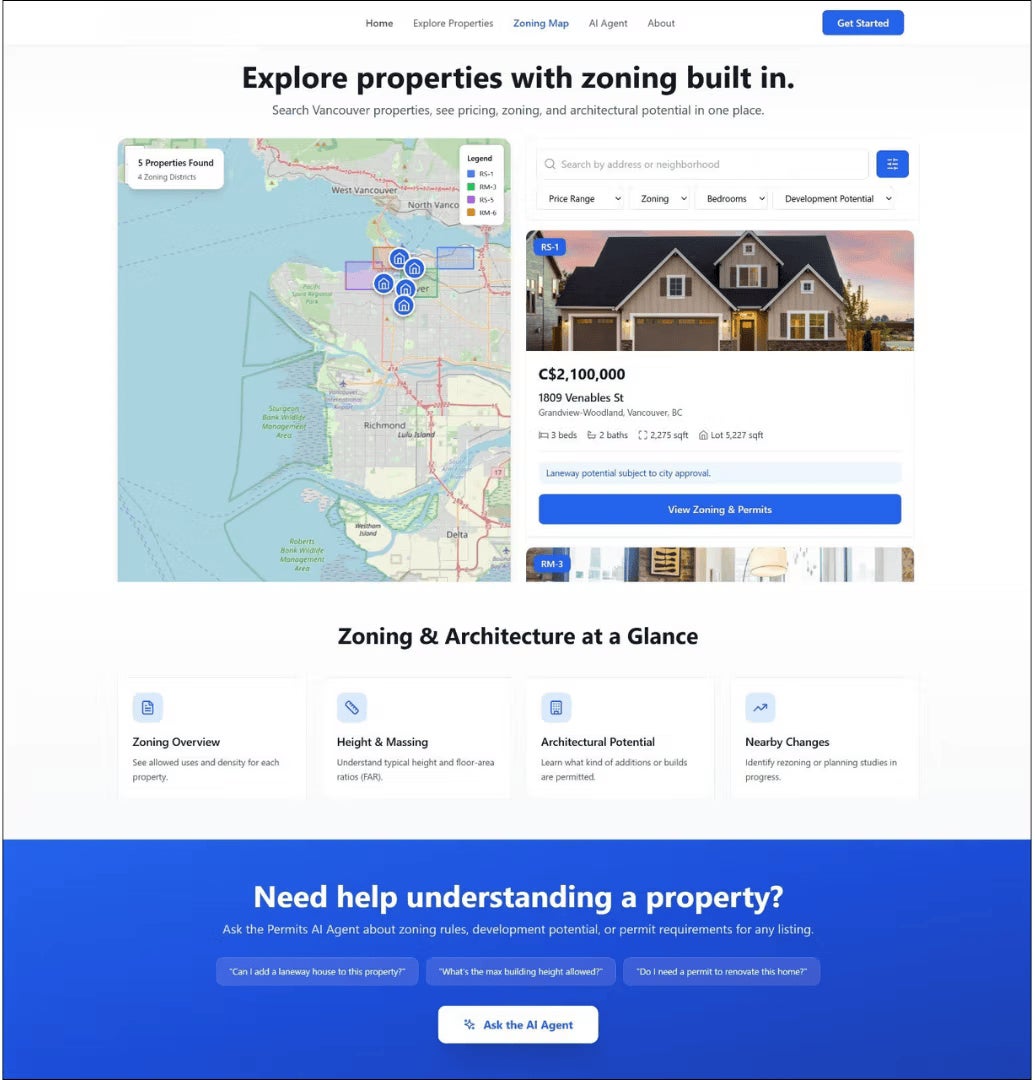Permits AI は、一般ユーザーからデベロッパーまで、計画・評価・建設を行うプロセスを変革するための次世代都市インテリジェンスプラットフォームです。リアルタイムで地理データ、用途解析、さらに生成AI を組み合わせることで、土地開発の意思決定の中核を担うことを目指しています。建築のあらゆる段階を、よりスマートに、迅速に可視化します。