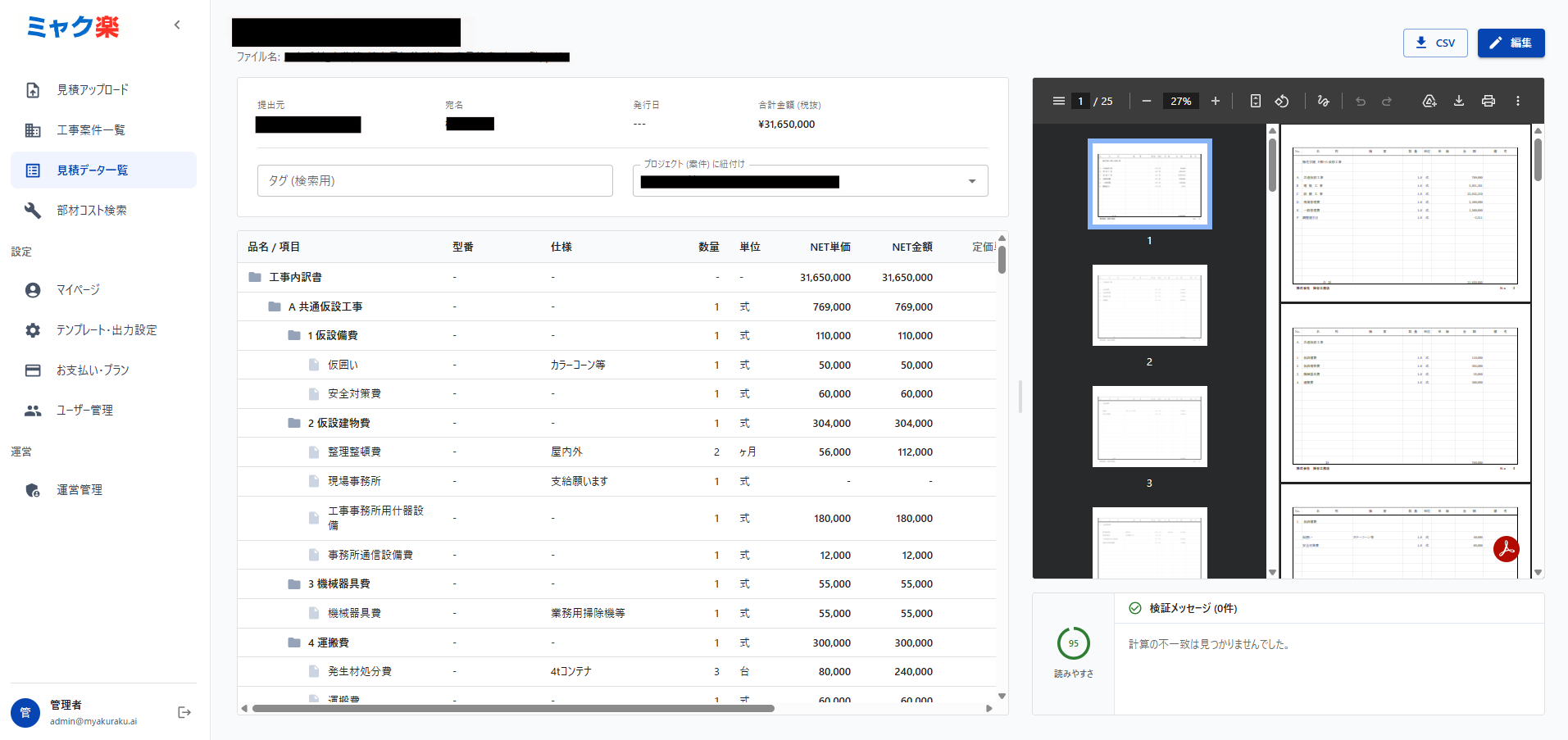 業者からのデータを自社の標準工種へAIが自動分類。マージンを設定するだけで、客先向け見積書をワンクリックで生成します。転記ミスを防ぎ、作成時間を90%以上削減しながら、精緻な利益管理が可能です。