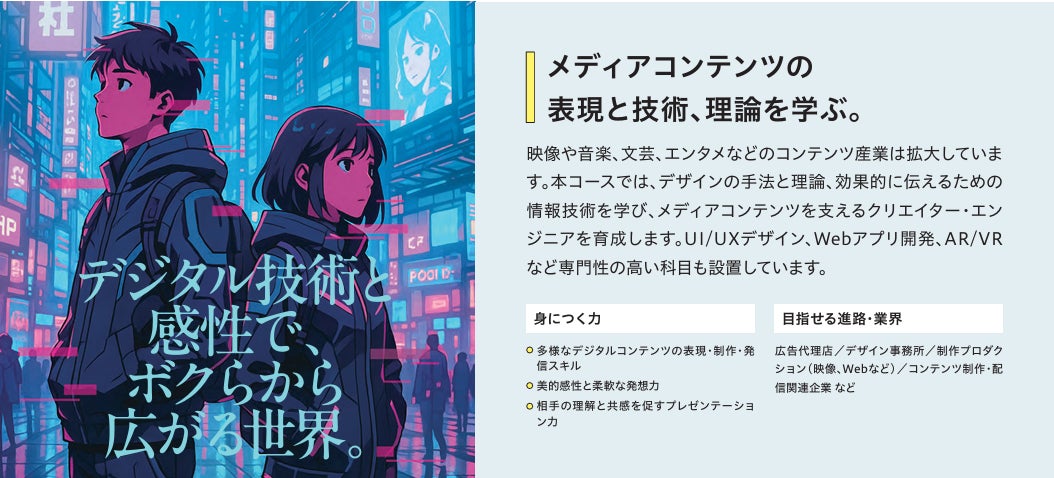 ②デジタルメディアデザインコース:映像、Webアプリ開発、UI/UXデザインなど、メディアコンテンツを支えるクリエイターやエンジニアを育成します。