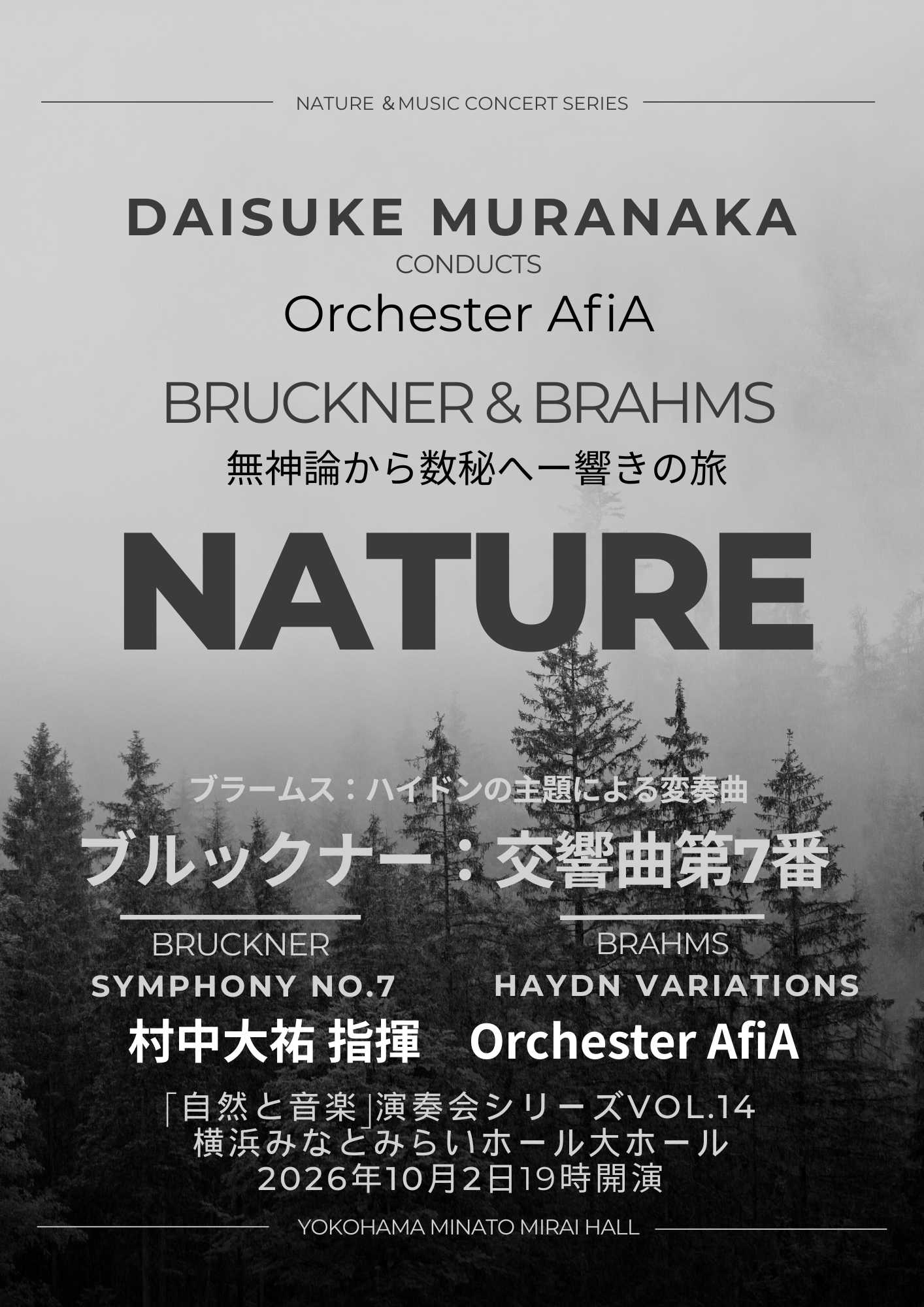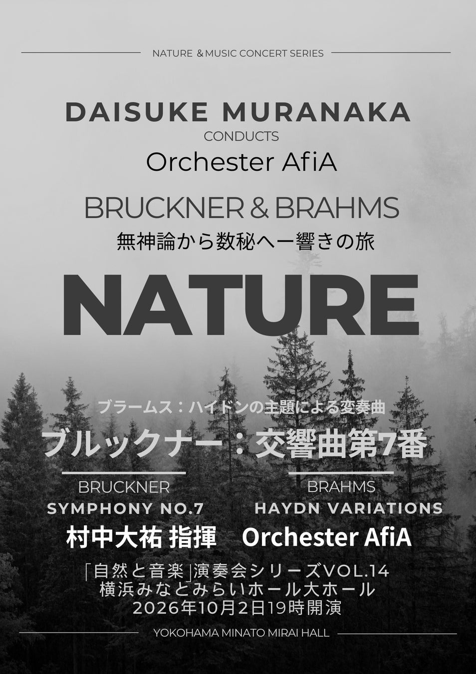 2026年10月2日(金)に横浜みなとみらいホールにて、村中大祐指揮 Orchester AfiA「自然と音楽」コンサートシリーズ Vol.14 開催決定