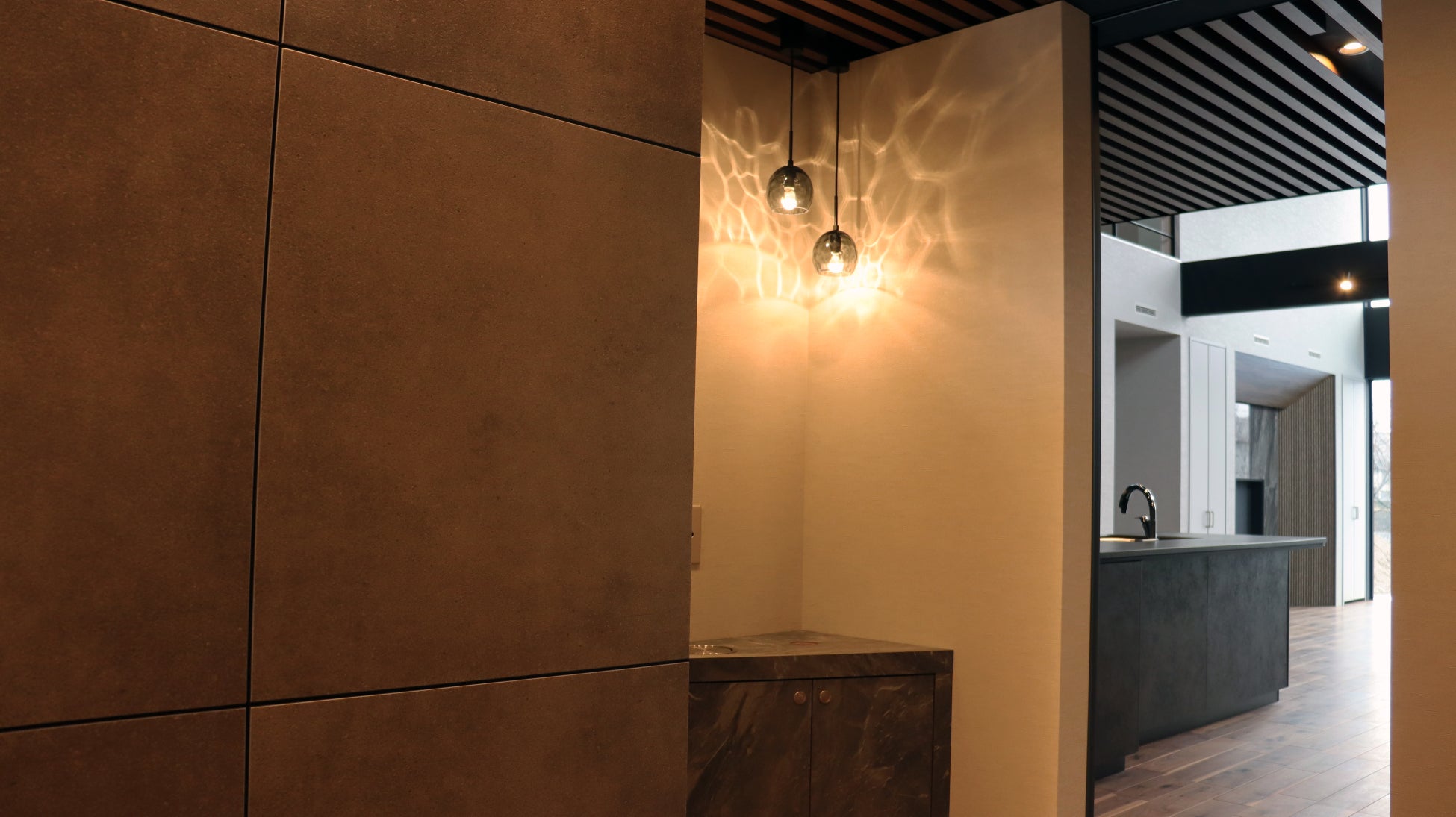今回公開する「Outshine」は、落ち着きと開放感を併せ持つホテルライクな住空間をテーマに設計された住まいです。約10帖の吹き抜け空間を中心に光と視線の抜けをつくり、日常の中に静かな広がりを感じられる空間構成としています。