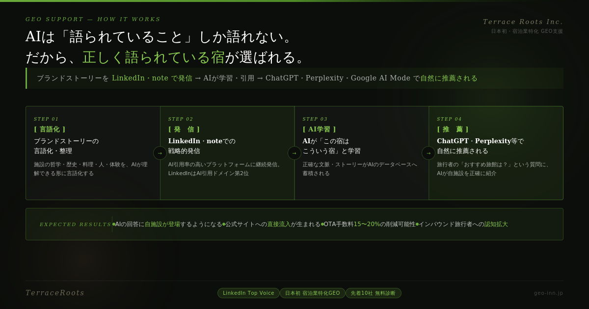 LinkedInはAI回答内での引用ドメインランキングで第2位に位置しており、LinkedInへの発信がそのままAIの学習データになりやすいという構造的な優位性があります。Terrace Rootsは、この仕組みを宿泊業に特化して体系化した、日本初のGEO支援サービスです。