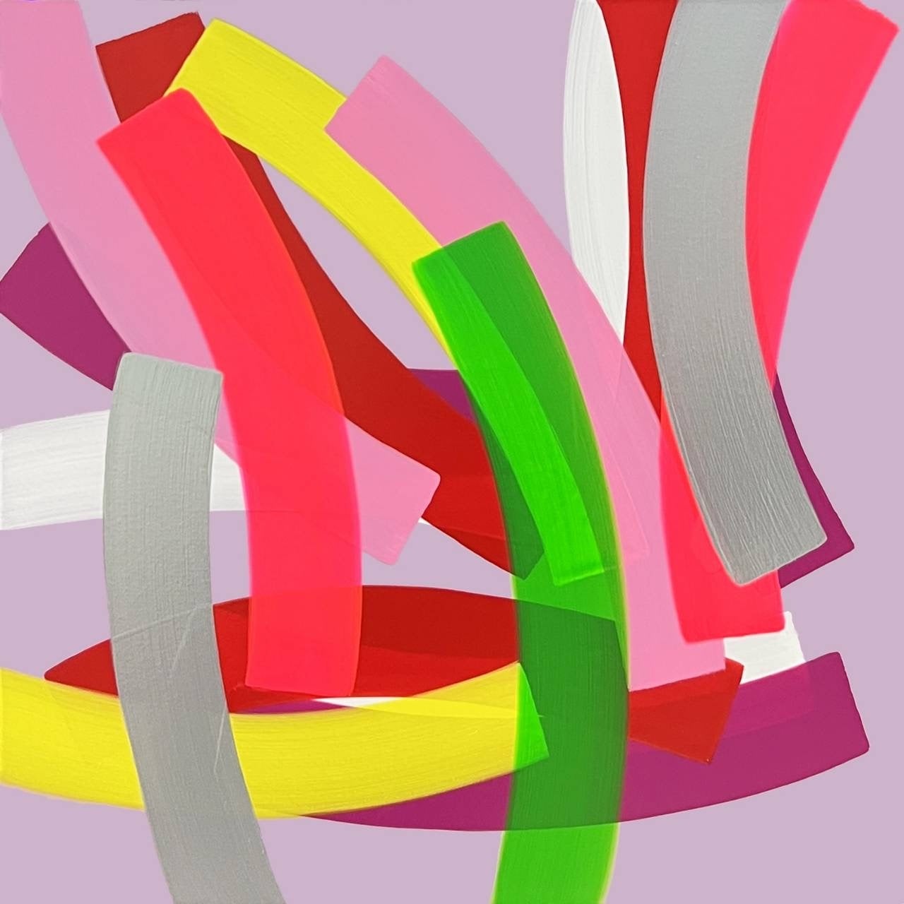 ハ・テイムの絵画は、即興的なジェスチャーの結果というよりも、むしろ反復と統制に基づいて形成されている。画面を満たす色帯は、一定の規則と緊張関係のもとで蓄積され、その過程において感覚的快楽と強迫的秩序との微妙な均衡が模索される。