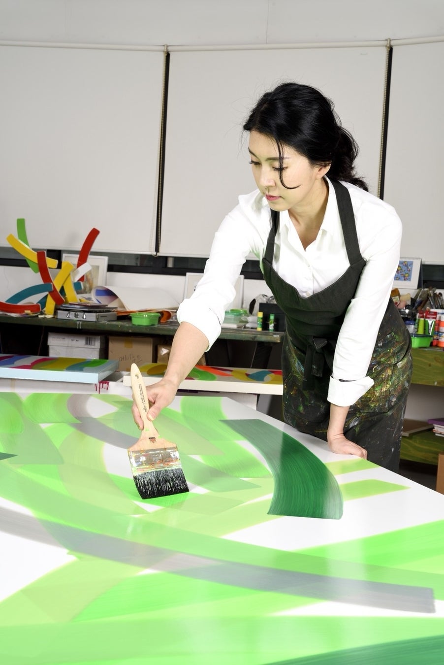 彼女の制作は、繰り返し重ねられる曲線状のカラーバンド(color band)を中心に展開される。画面上に蓄積される有機的な色面は、単なる造形要素にとどまらず、人間の思考や感情、そして情緒的状態を感覚的に翻訳する一種の視覚的メディアとして機能している。