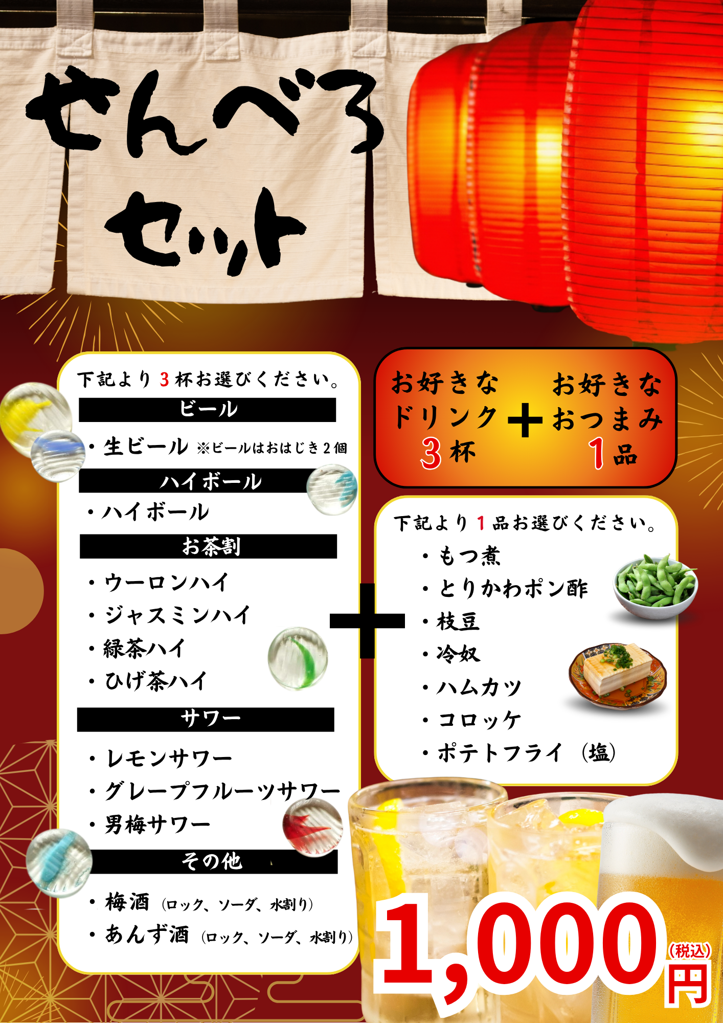 税込1,000円で生ビール含むドリンク3杯+おつまみ1品が楽しめる「せんべろセット」が最大のウリ。