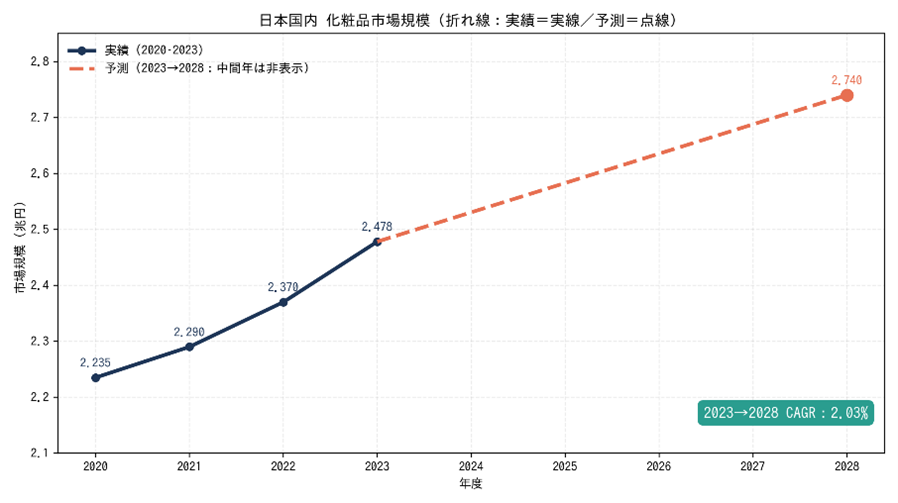 日本の化粧品市場は、2020年のコロナ禍で一時的に縮小したものの、2021年以降は回復基調が続き、2023年度には 2兆4,780億円 とコロナ前水準へほぼ回復しました。