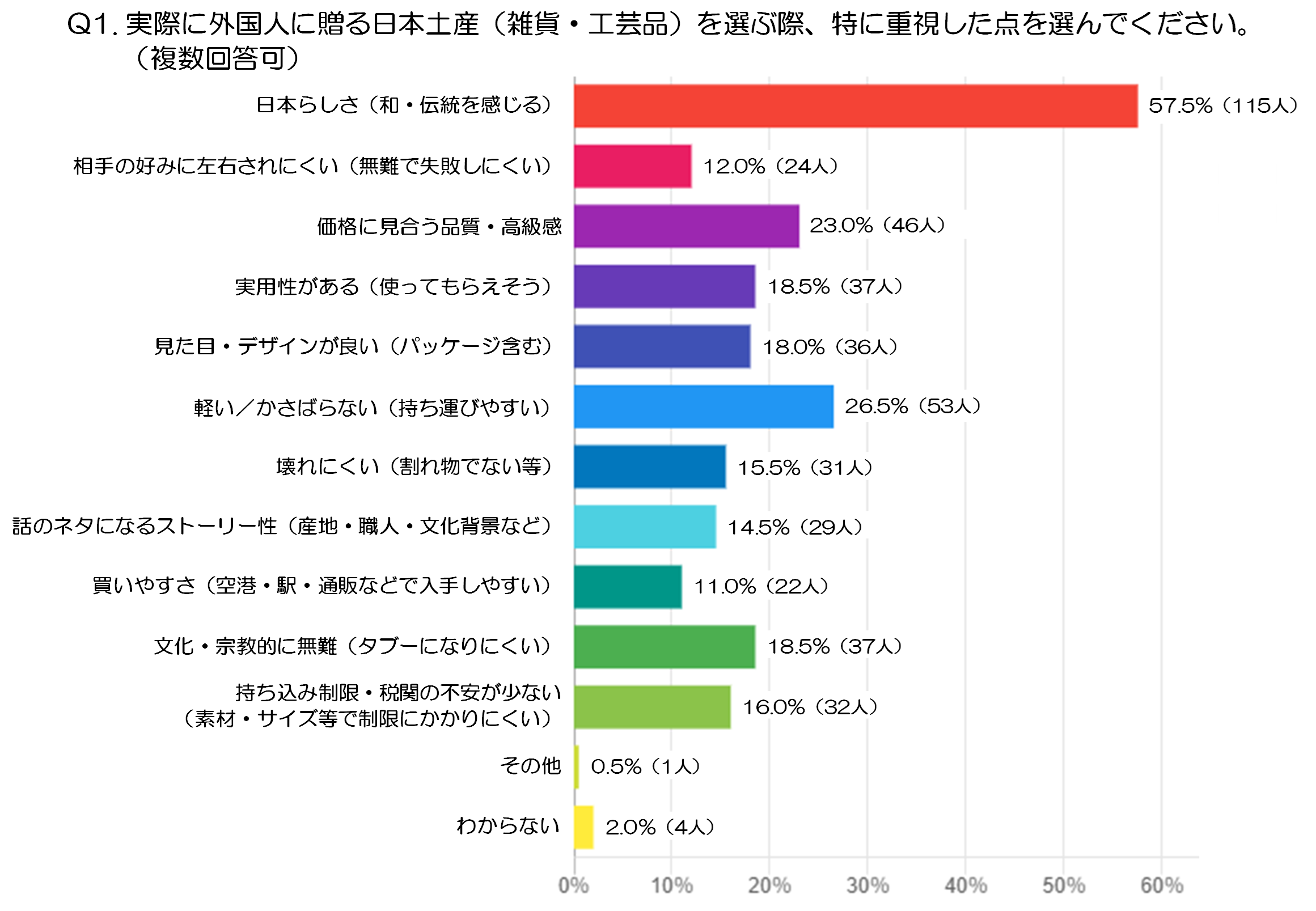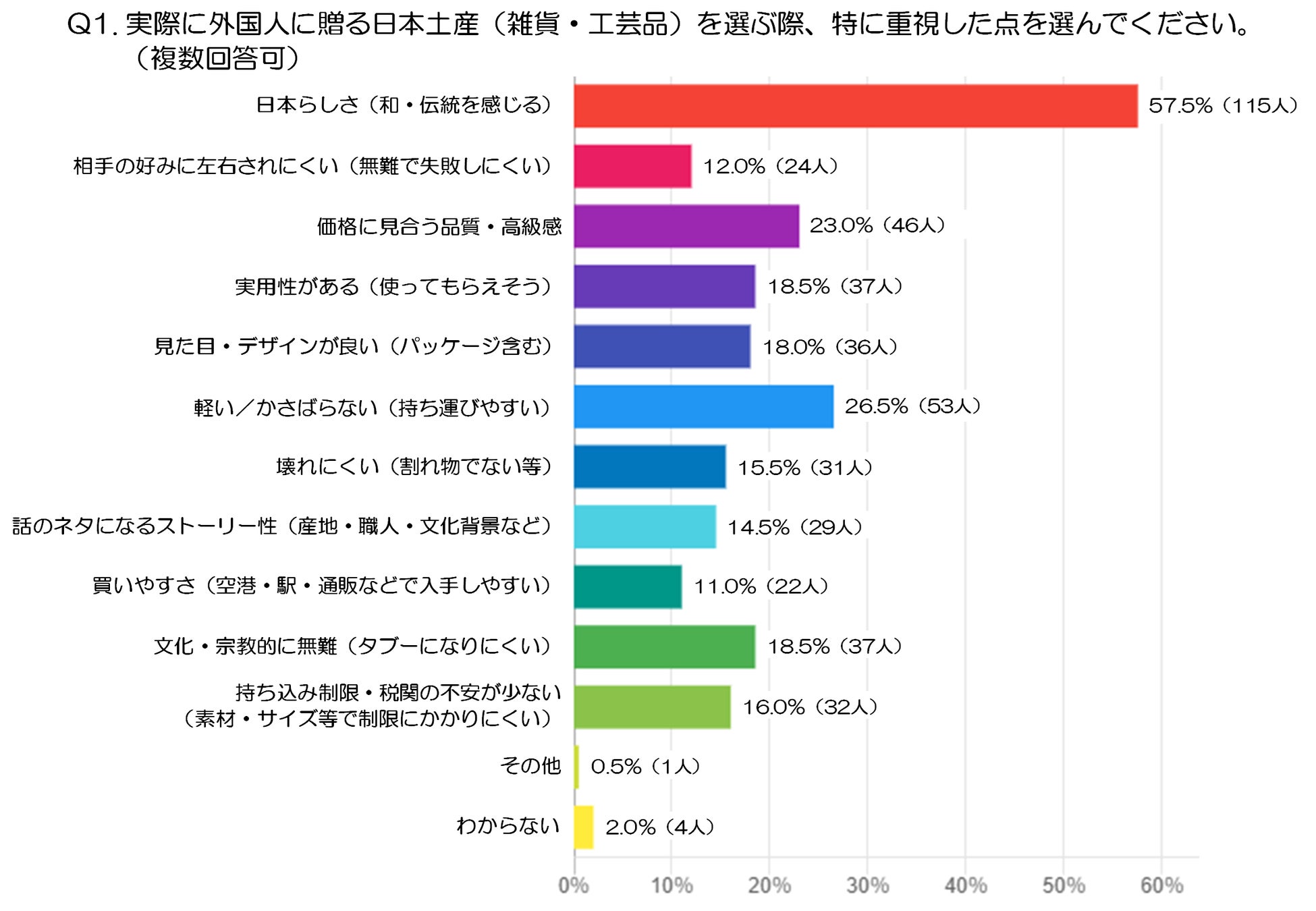 1.Q1:実際に外国人に贈る日本土産(雑貨・工芸品)を選ぶ際、特に重視した点を選んでください。(複数選択可:注1)