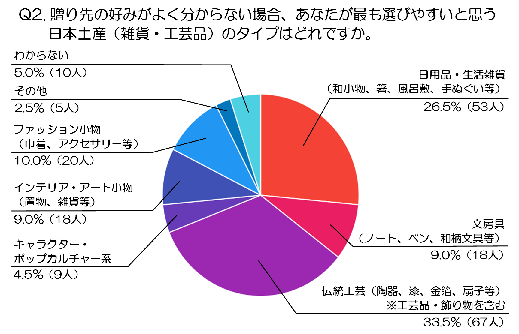 また、「5,000〜9,999円」も18.0%(36人)と一定数を占めており、相手との関係性や贈るシーンによっては、少し特別感のある価格帯を選ぶケースも少なくないことが分かります。日本らしい工芸品や上質な雑貨など、品質や印象をより重視したい場面では、このあたりの予算感が意識されているのかもしれません。