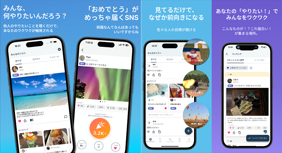 「死ぬまでにやりたい100のこと」を書き出し、達成を記録・共有できるバケットリストSNSアプリです。
