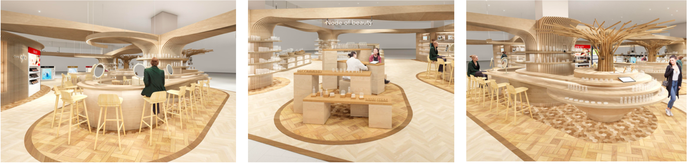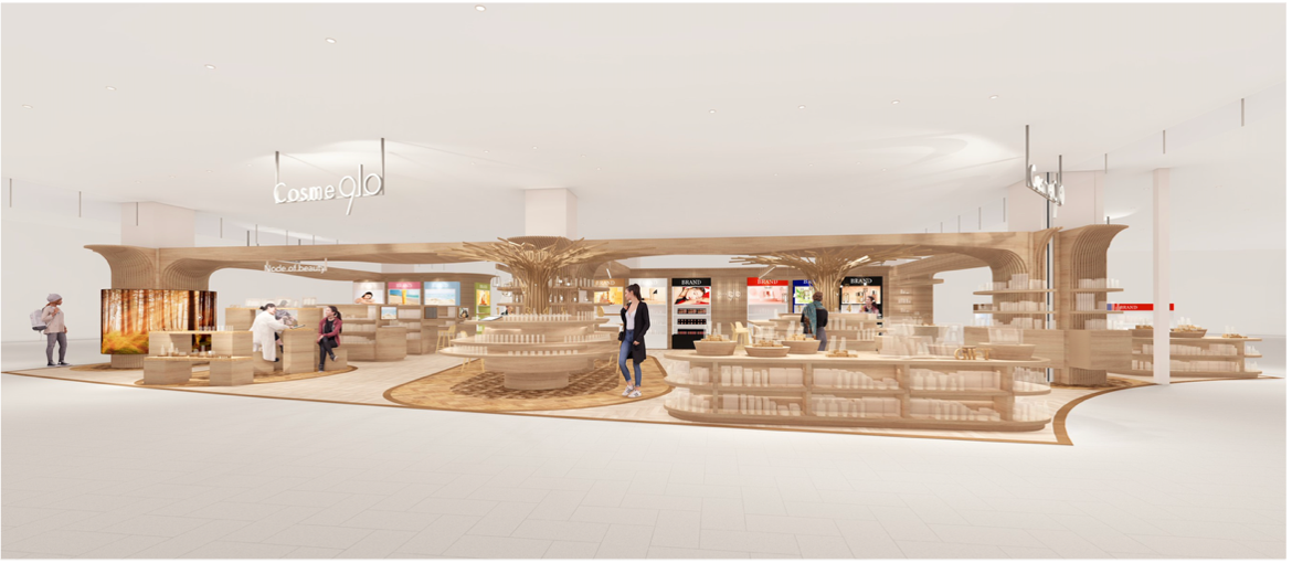 旭川の豊かな自然と、都市の心地よい距離感をコンセプトに、空間デザインは“都市の中の森”をイメージして設計。木のぬくもりを活かした什器や、中心に象徴的に配置されたツリー型ディスプレイは、まちと森、人と人をつなぐことで美しさを生み出す結節点としての存在を体現しています。旭川の自然環境に着想を得た開放感のあるレイアウトは、セルフセレクトとカウンセリングが心地よく共存する空間を実現し、世代を超えて“キレイ”を楽しめるコミュニティ型コスメ専門店としての新しい在り方を提案いたします。