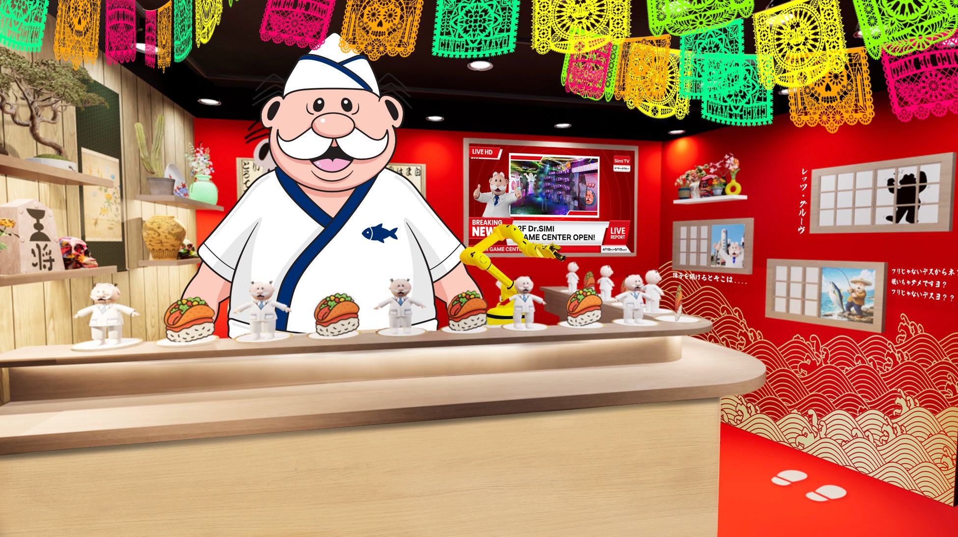 1Fは、来場者が最初に足を踏み入れる“Dr.Simiとのワクワクの出会い”のフロア。板前風に変身したDr.Simiが迎えるユニークな寿司カウンターや、日本上陸のニュースを届けるSimiTVや、旅行ノートや思い出の写真が並ぶ“Simiの部屋”など、遊び心あふれる演出が満載です。日本×メキシコが融合したカラフルな世界観の中で、Dr.Simiのストーリーと魅力を楽しく体感できる、心が弾むスタート地点です。