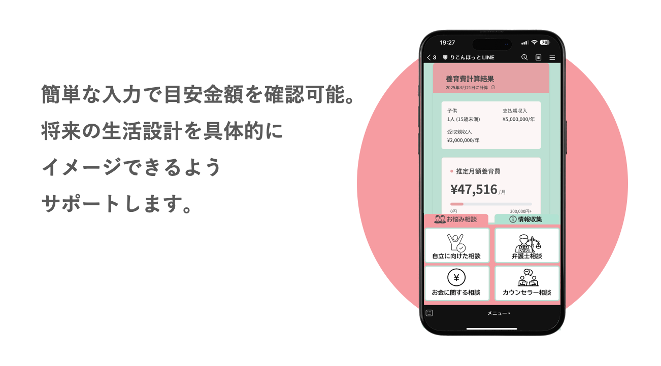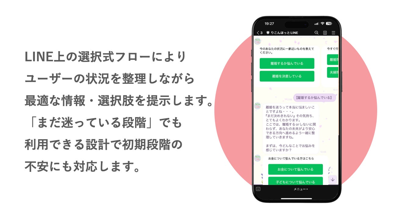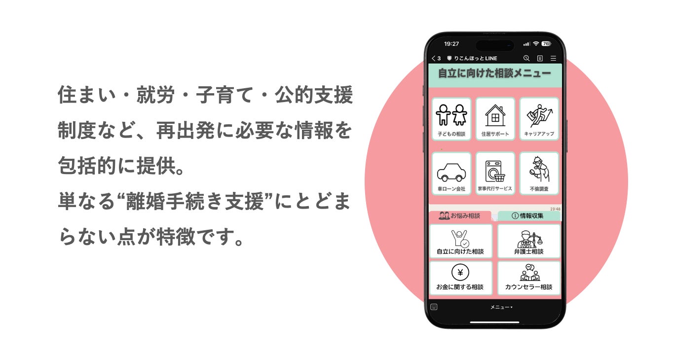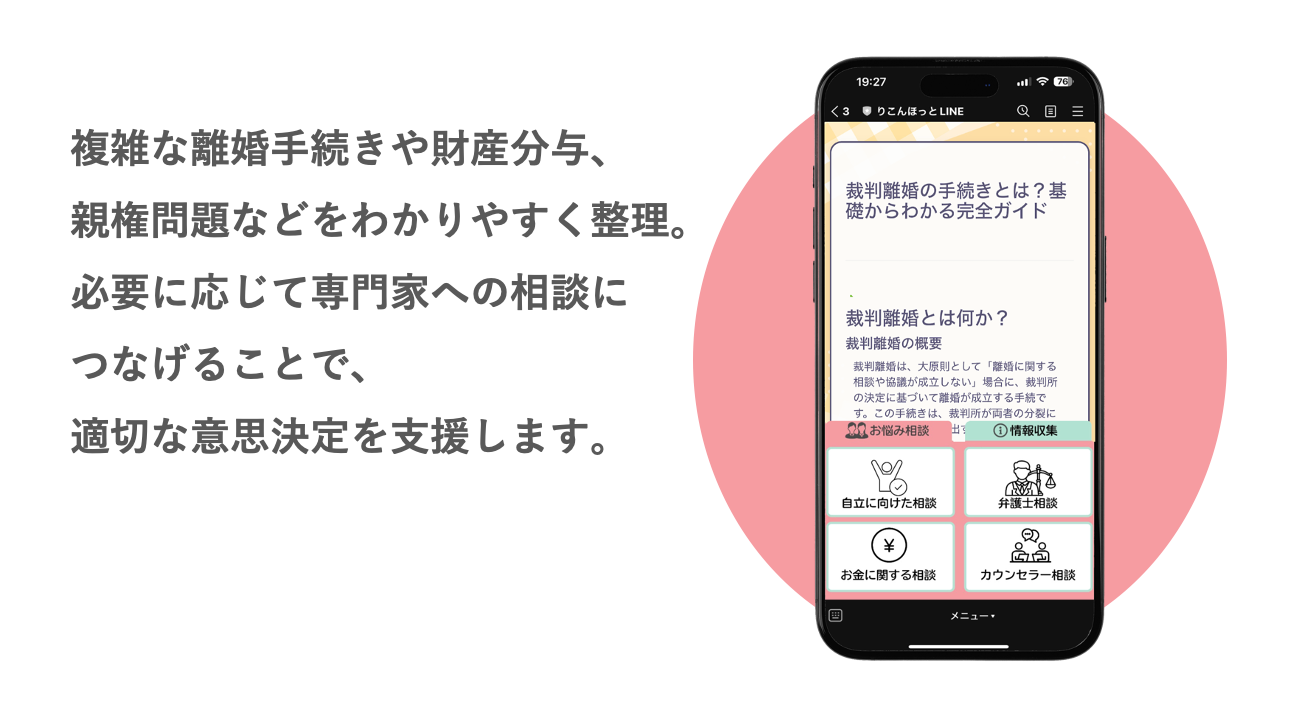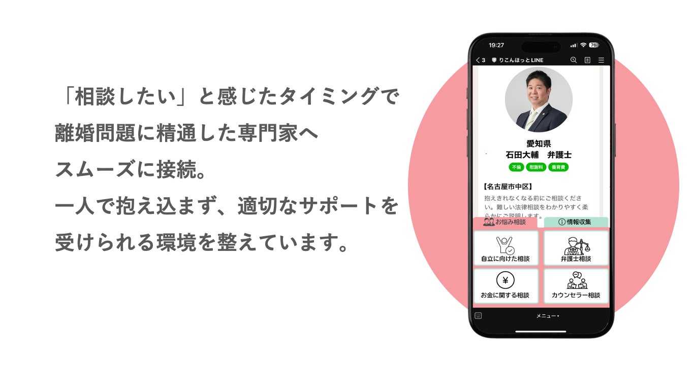 「りこんほっとLINE」は、離婚相談・夫婦問題に関する情報提供から専門家相談までを、LINE上で一貫してサポートするサービスです。