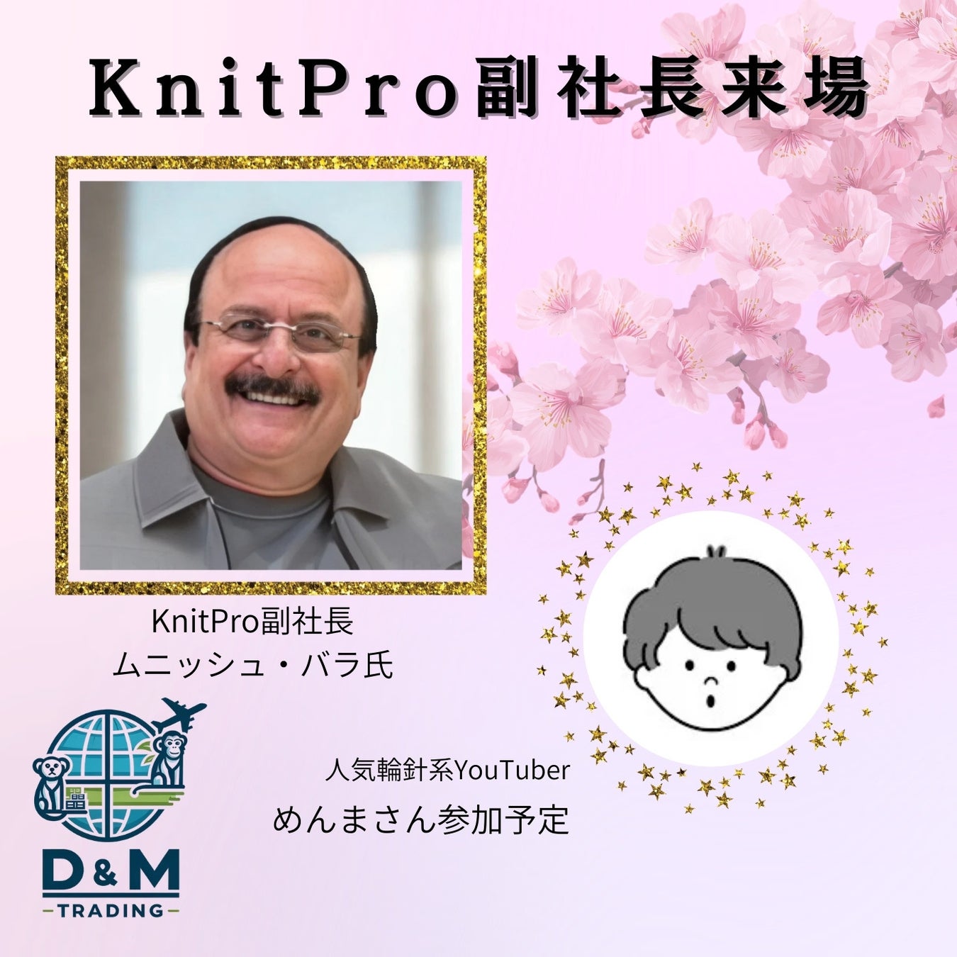 特別ゲストとして、KnitPro社副社長 ムニッシュ・バラ(Munish Bhalla)氏、ならびに人気輪針系YouTuber めんまさん(@menma_______) の来場を予定しております。